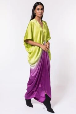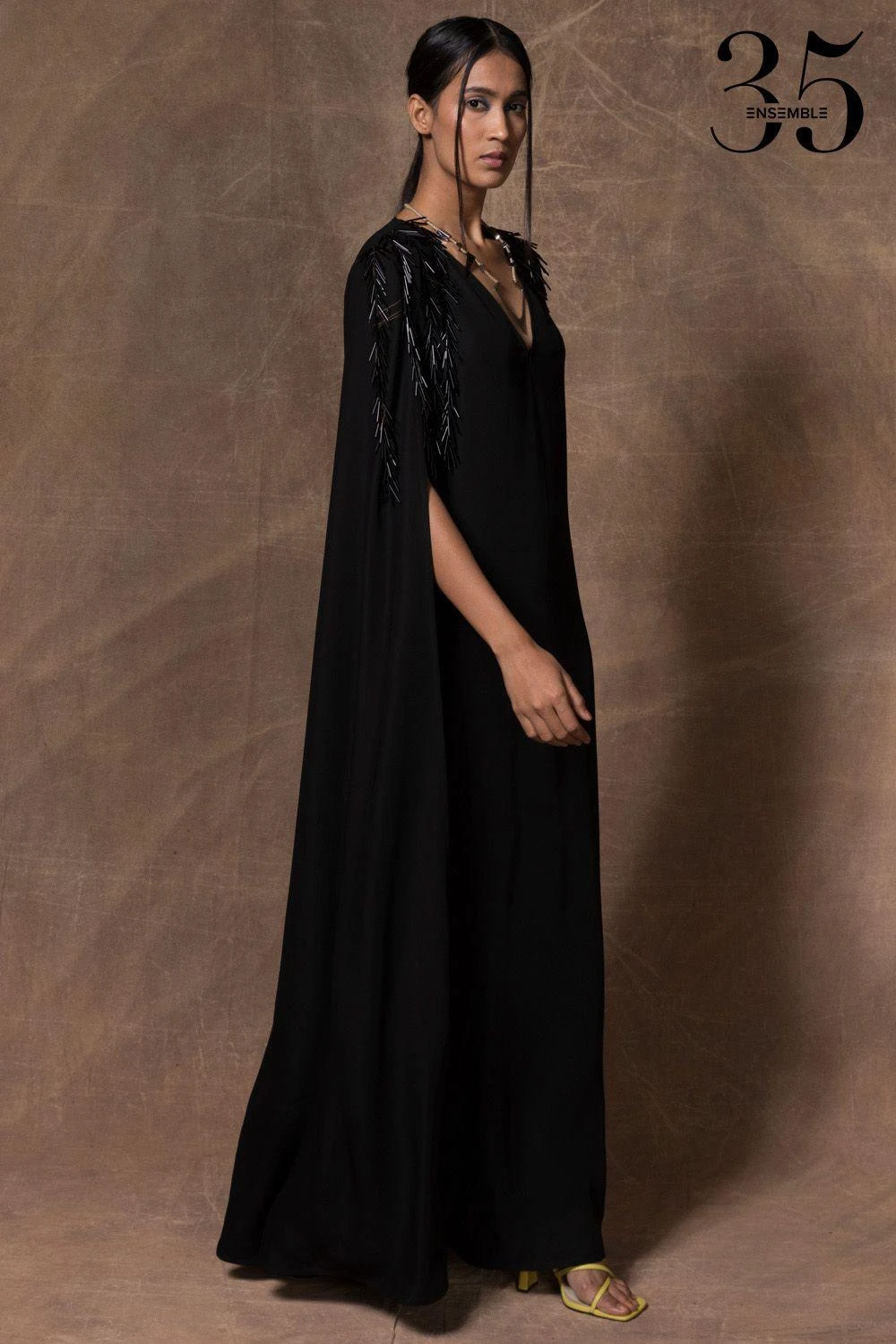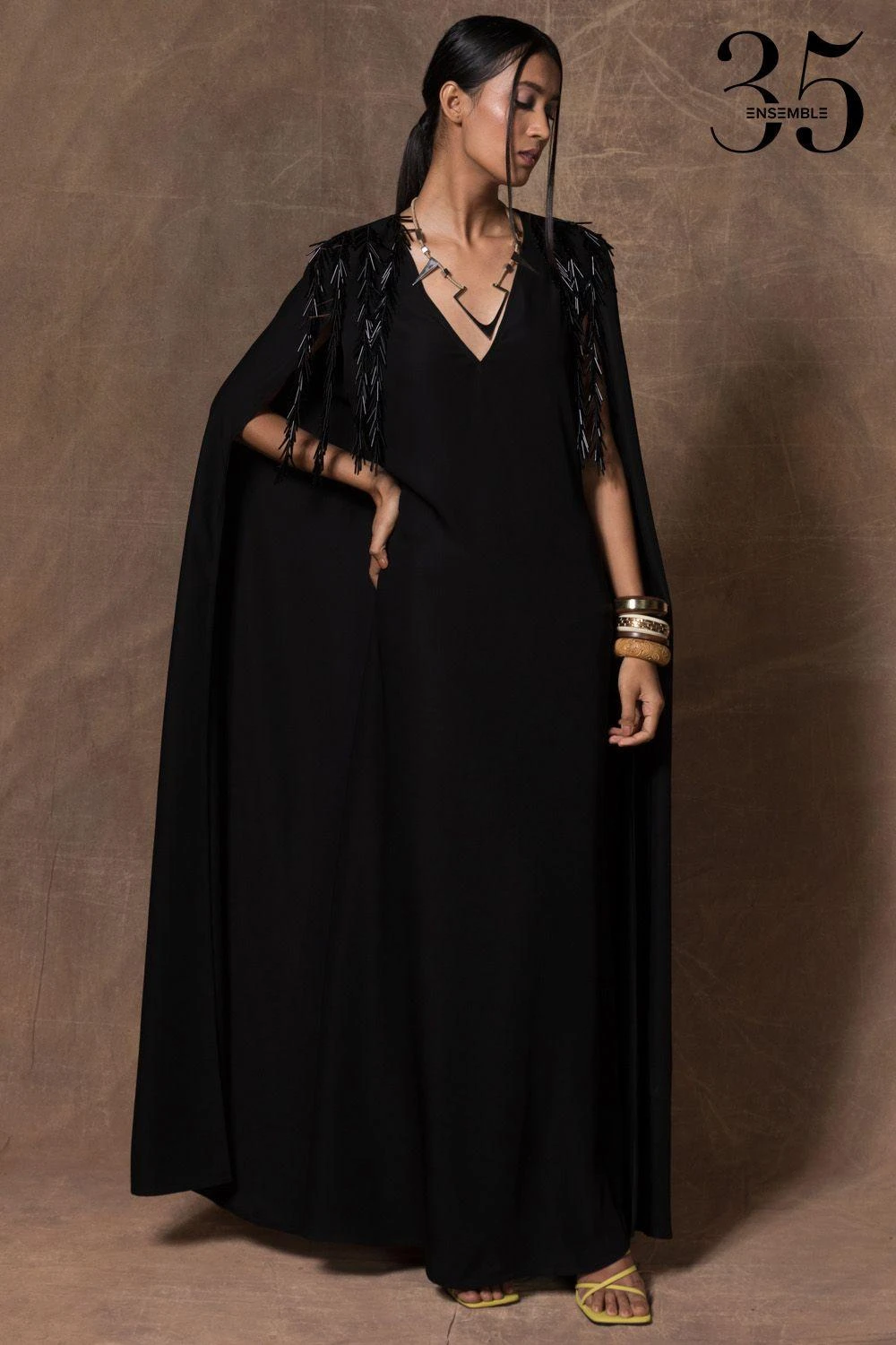 A yearlong celebration of its 35th anniversary telling the story of modern Indian fashion. This black long maxi dress makes glamour look easy & comfortable. It features long cape sleeves & tonal accents on the shoulder.