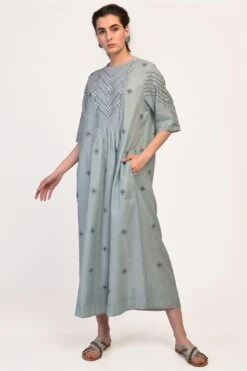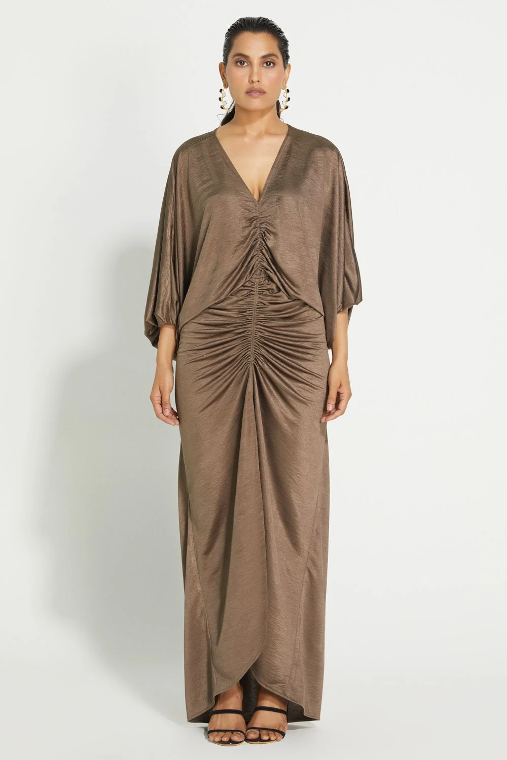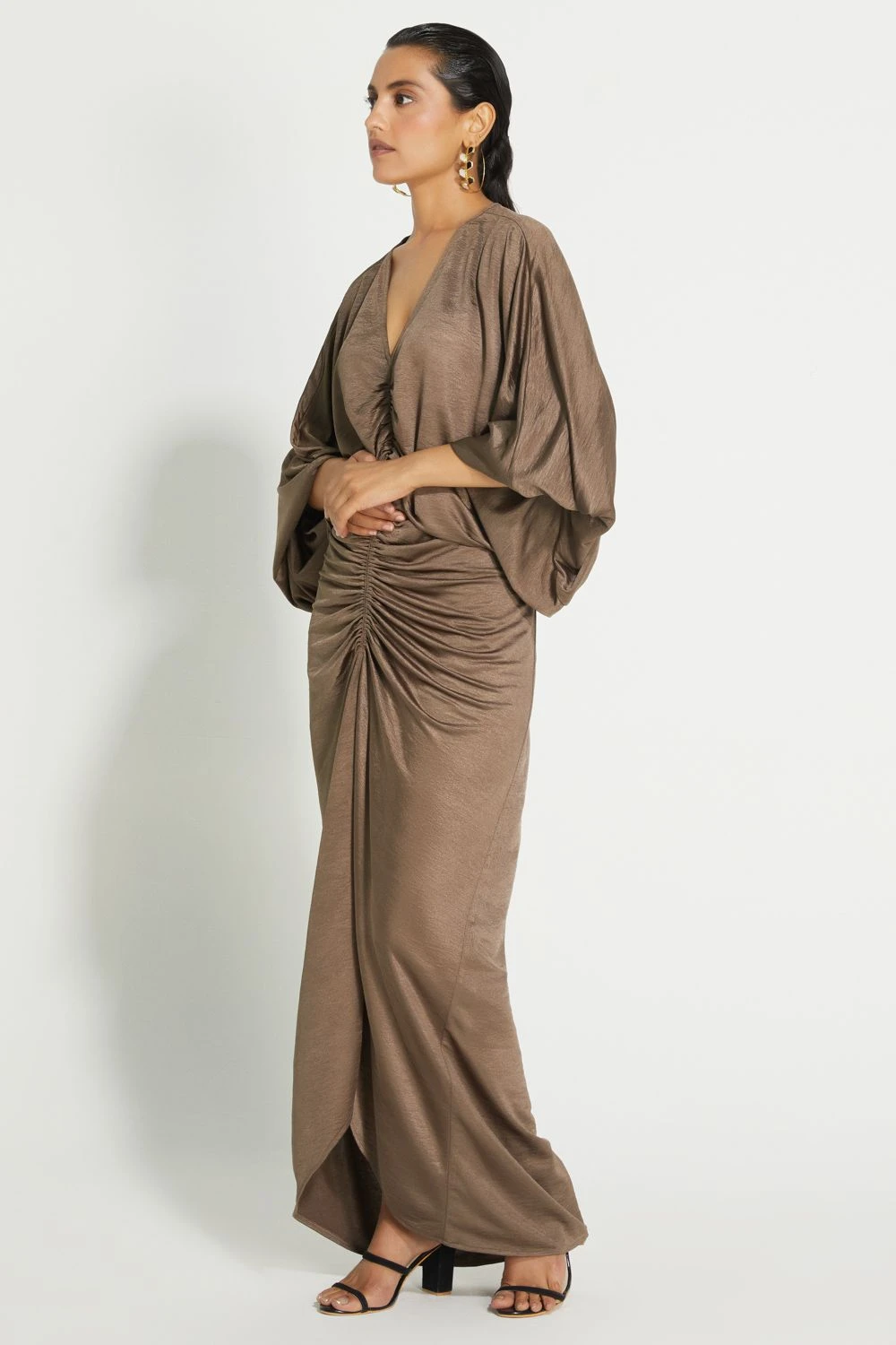 This relaxed fit olive kaftan in crushed jersey fabric falls beautifully on the body. It features a draped ruched detail along the front and is finished with dramatic sleeves & V-neckline. Dress it up with a pair of heels and some jewellery.