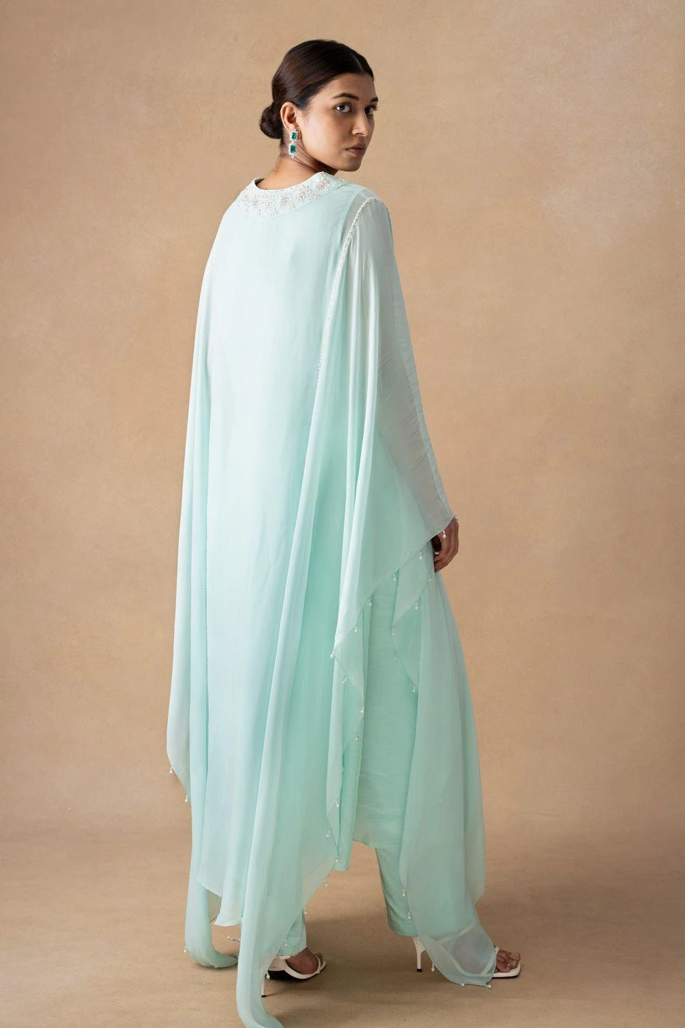 Step into opulence with the Blue Floral Kaftan Set. Luxuriously crafted in georgette, embellished with pearls & sequins, this ensemble tells a tale of elegance. The set features a majestic kaftan, complemented by an inner layer & chic pant.