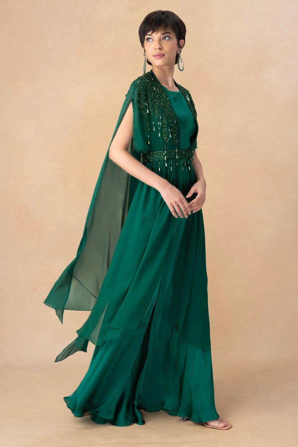 Summer festivities call for easy-breezy outfits like this cape set. This cape features crystal embellishments and comes with a pair of pants, a crop top and a belt. You can team it up with a pair of elegant statement earrings to complete the look.