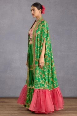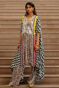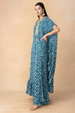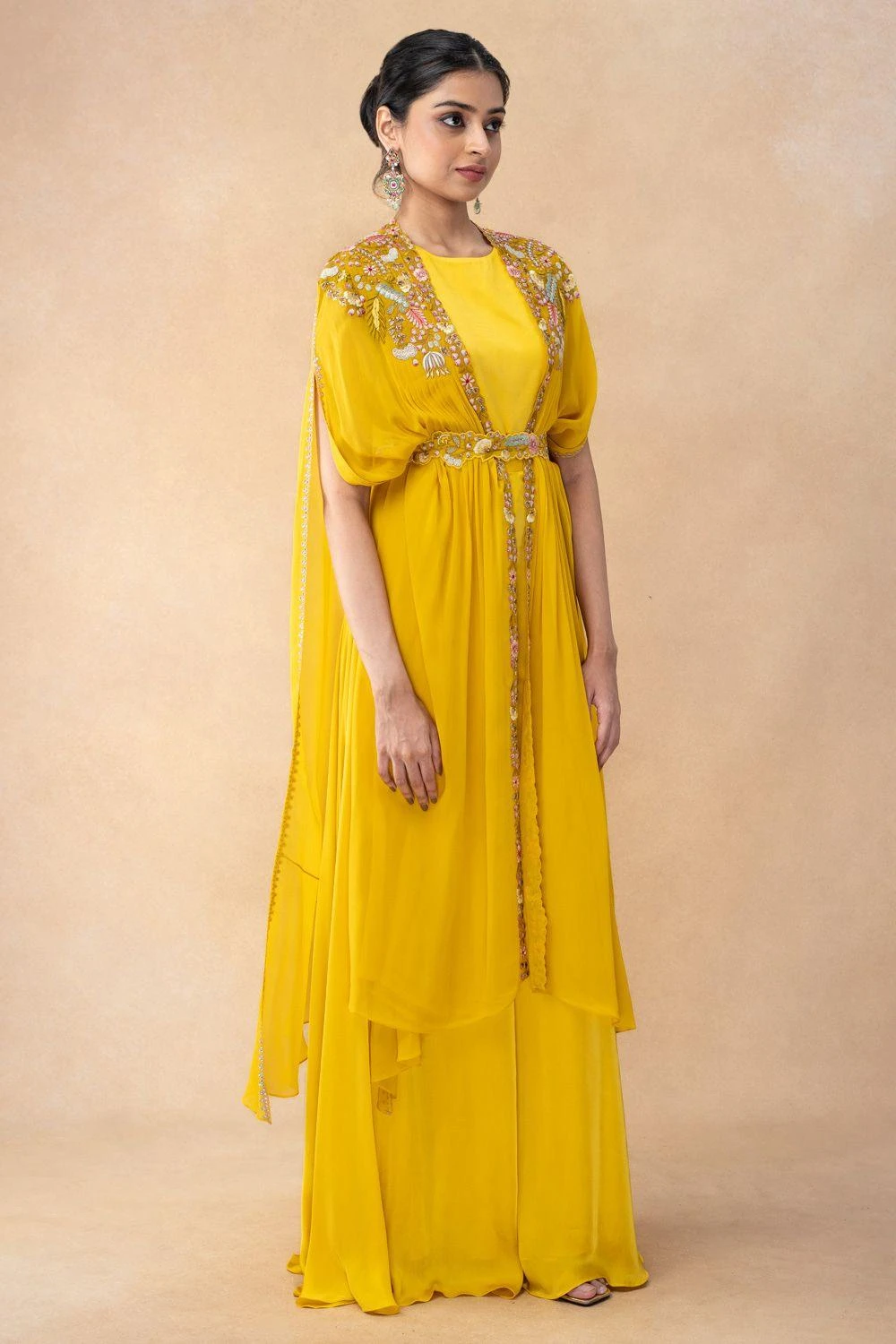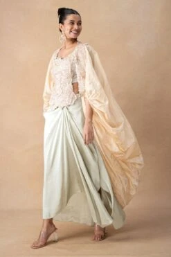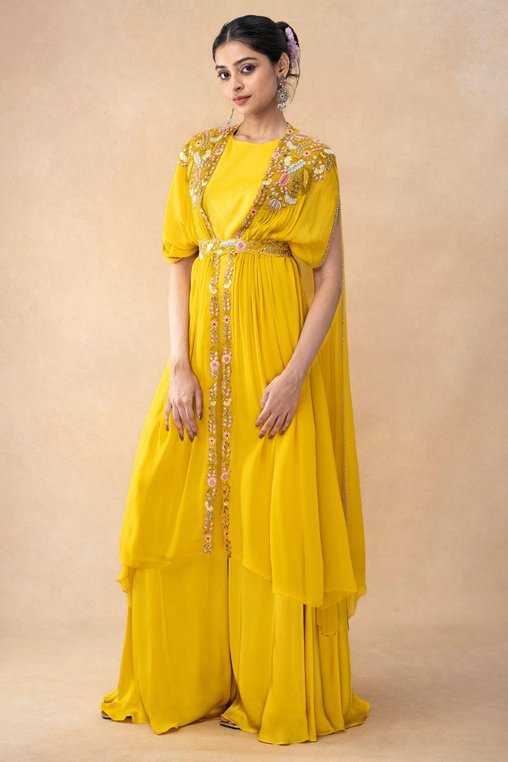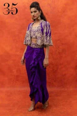 Summer festivities call for easy-breezy outfits like this cape set. This cape features crystal embellishments and comes with a pair of pants, a crop top and a belt. You can team it up with a pair of elegant statement earrings to complete the look.