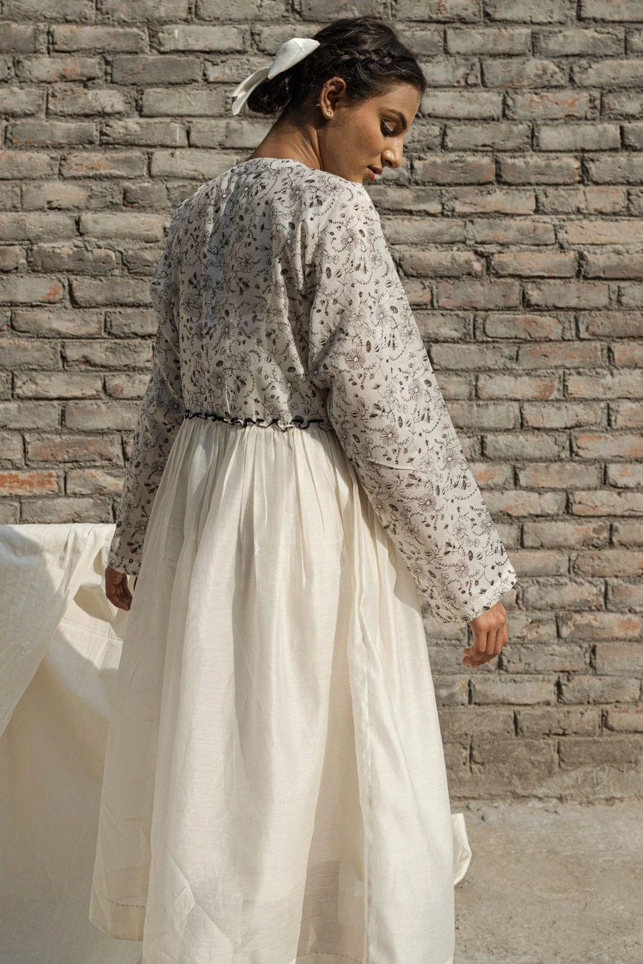 Look effortlessly stylish with this dress. The dolman sleeves are crafted with intricate screen printing by hand, lending them a statement quality that perfectly complements the gathered waist & adds a touch of artisanal charm to the dress.