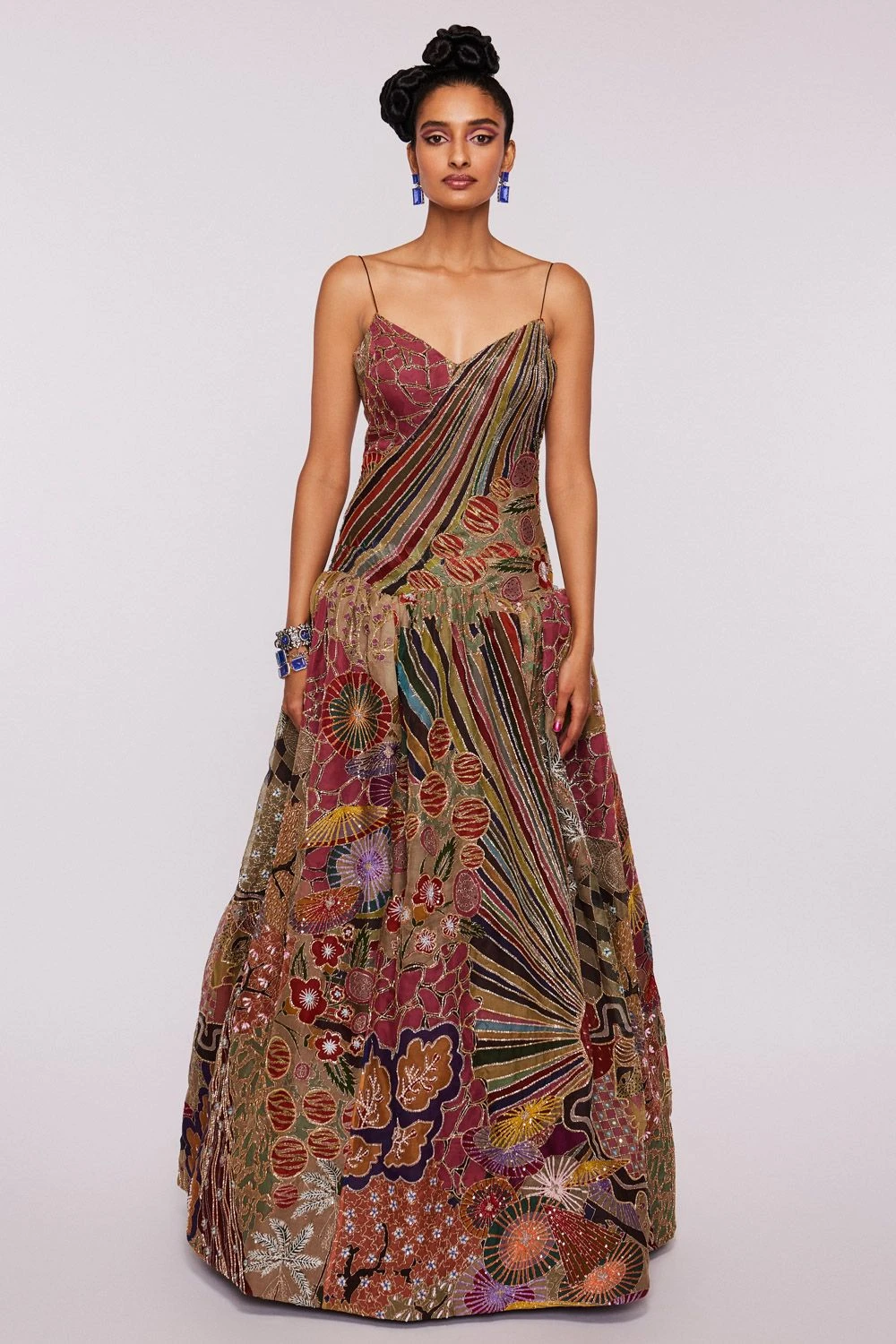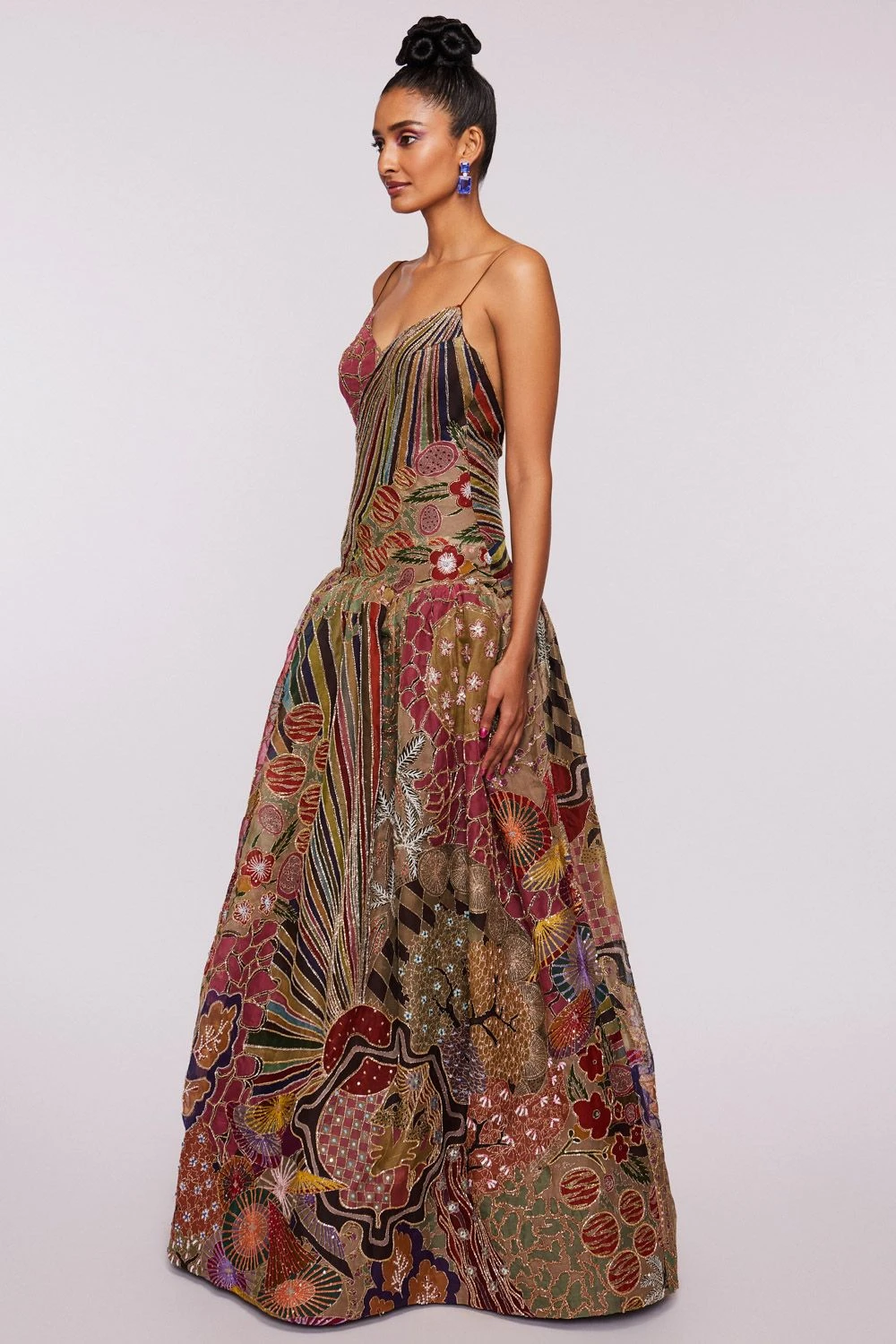 For the modern day brides, this wine printed gown is everything you need to stand out in the crowd. It is made in patchwork printed organza base and uplifted with intricate gold details. You can adorn a pair of diamond danglers with this look.