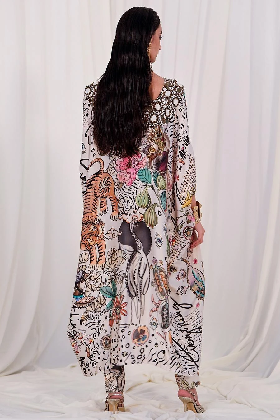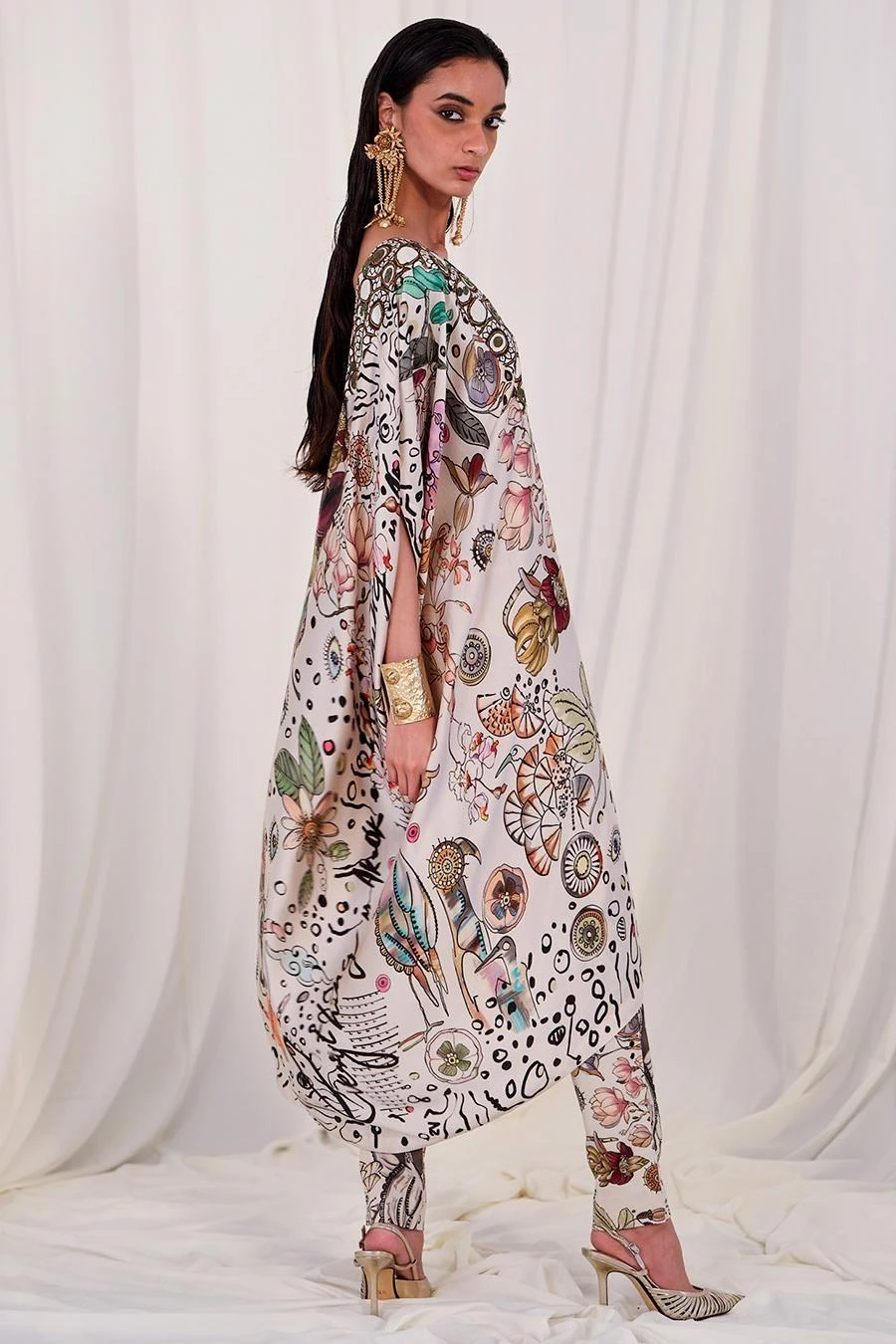 Look sartorially savvy with this cape set. Crafted in chiffon, this set features an abstract printed fitted cape paired with coordinating pants. Add a pair of dangler earrings to complete the set.