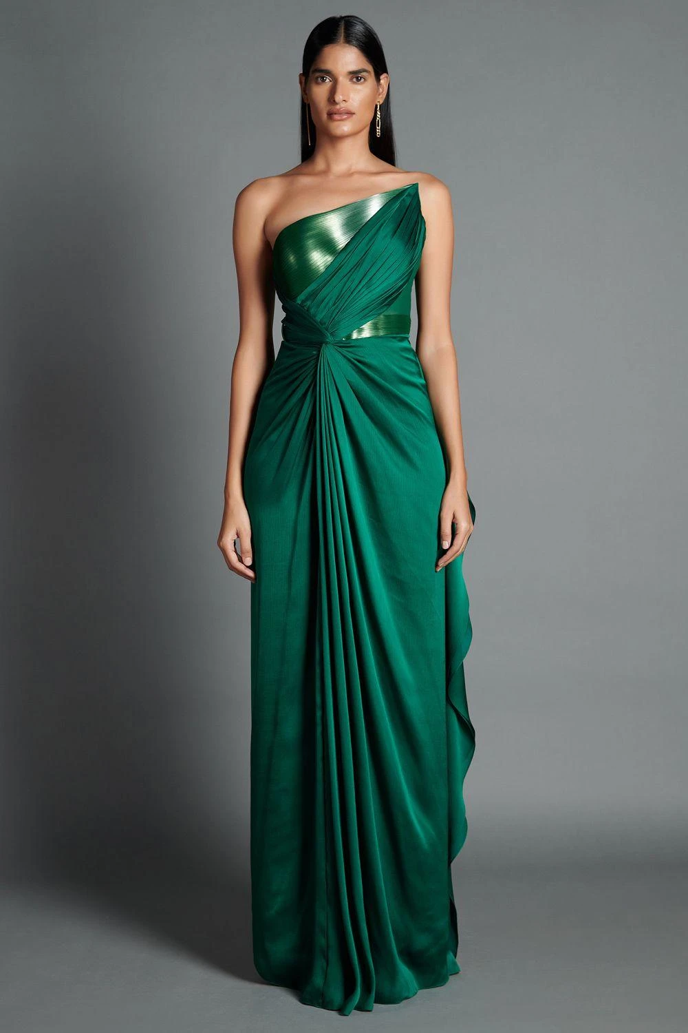 This emerald green metallic moulded twist gown is draped in a crinkled chiffon & satin lycra. The gown’s sultry silhouette makes it perfect for a cocktail evening.