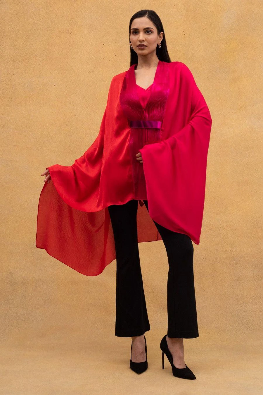 This panelled cape fetches ease & elegance at the same time. It is cut in luscious chiffon fabric and features hand woven metallic polymer yoke & placket and comes with a belt & inner. You can style it with a pair of tailored black trousers.