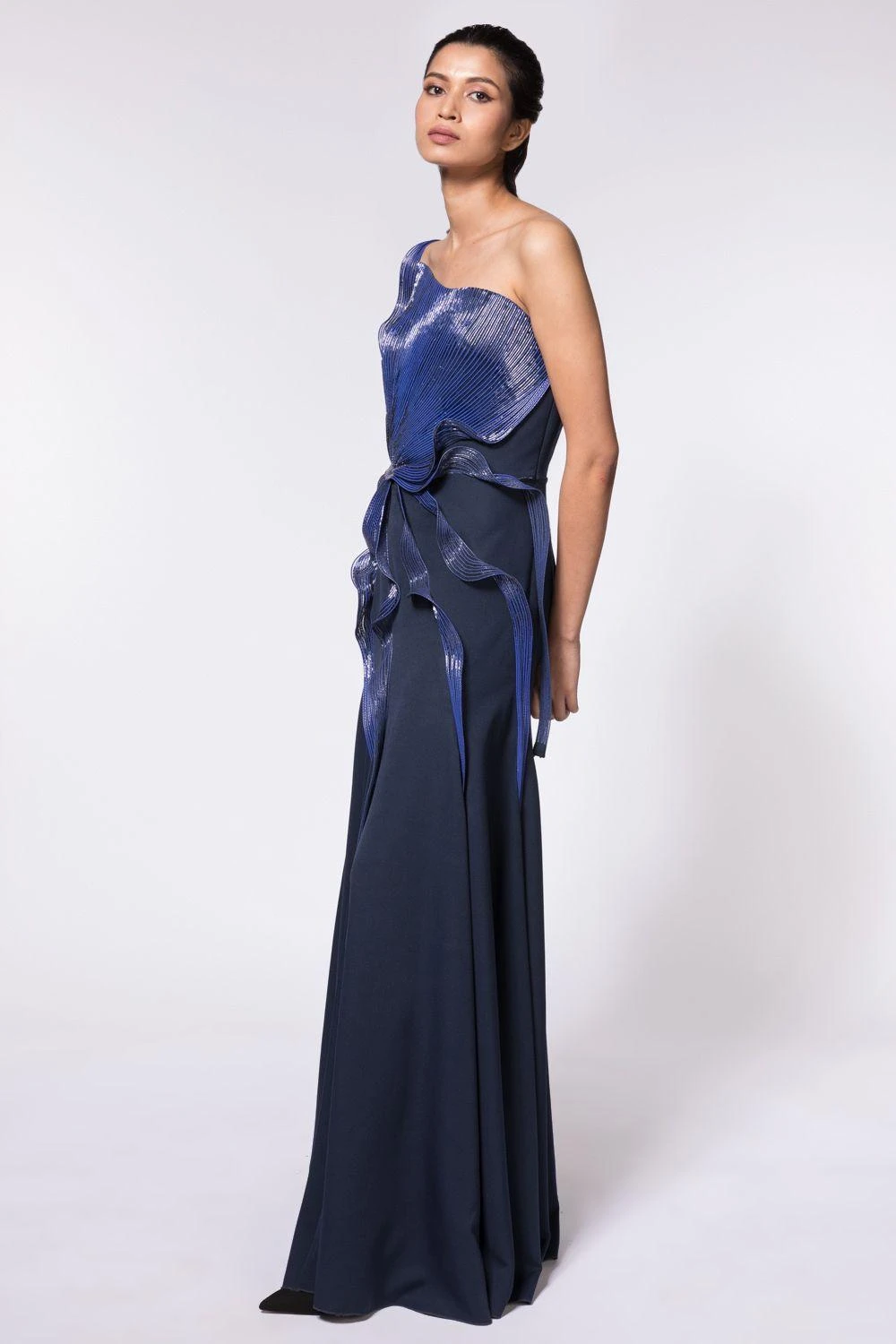 This sultry navy blue gown is structured in a metallic mesh fabric. This statement piece is perfect for a dressy cocktail evening. Style this one of a kind piece with diamond earrings for a stylish evening look.