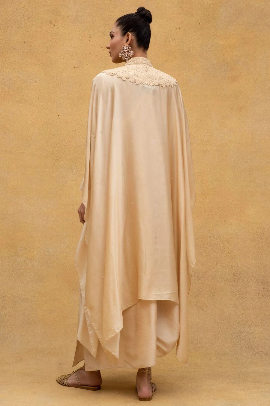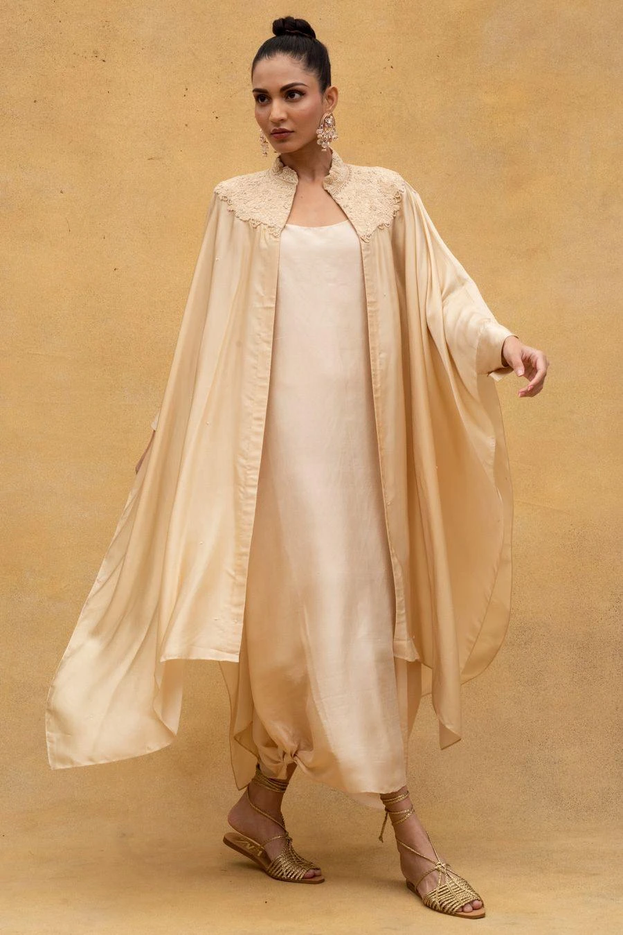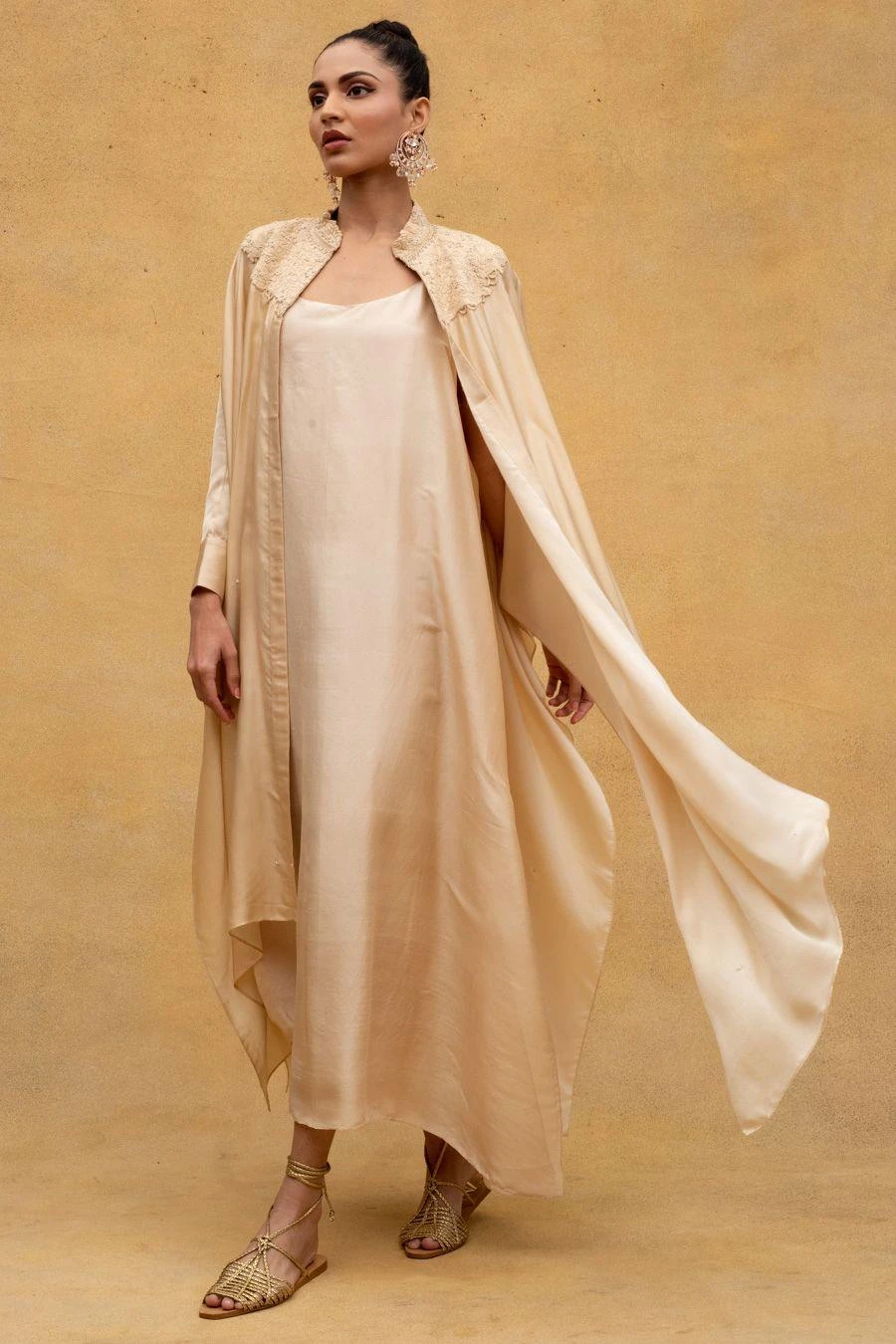 Contemporize your ethnic closet with this super chic & playful set. Crafted in silk, this set features a thread embroidered cape paired with a coordinated dress. Adorn a pair of statement earrings to complete the look.
