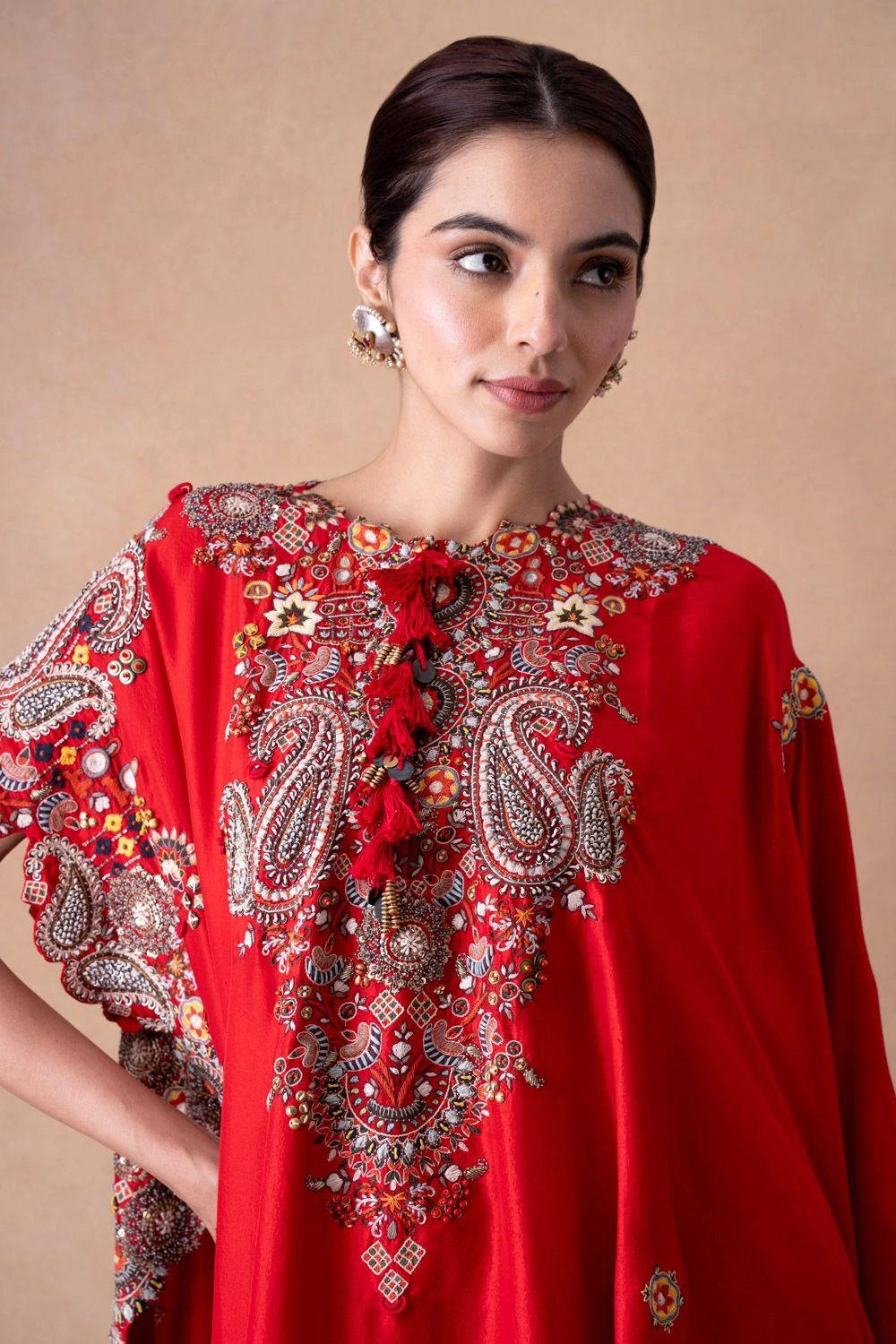 Embark on a sartorial journey with the silk kaftan-skirt set. Adorned with floral, paisley & sequin motifs, enhanced by elegant tassels. Effortlessly transition from sunlit soirÒes to moonlit galas. Elevate every occasion with grace & glamour.