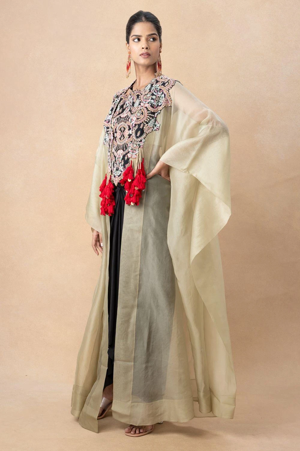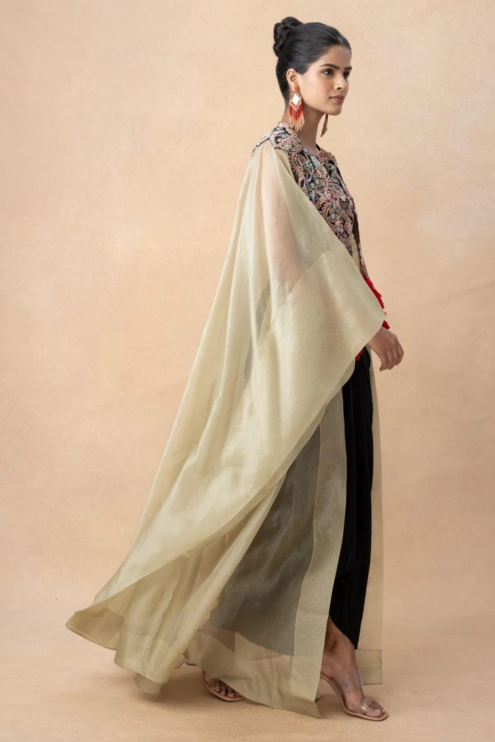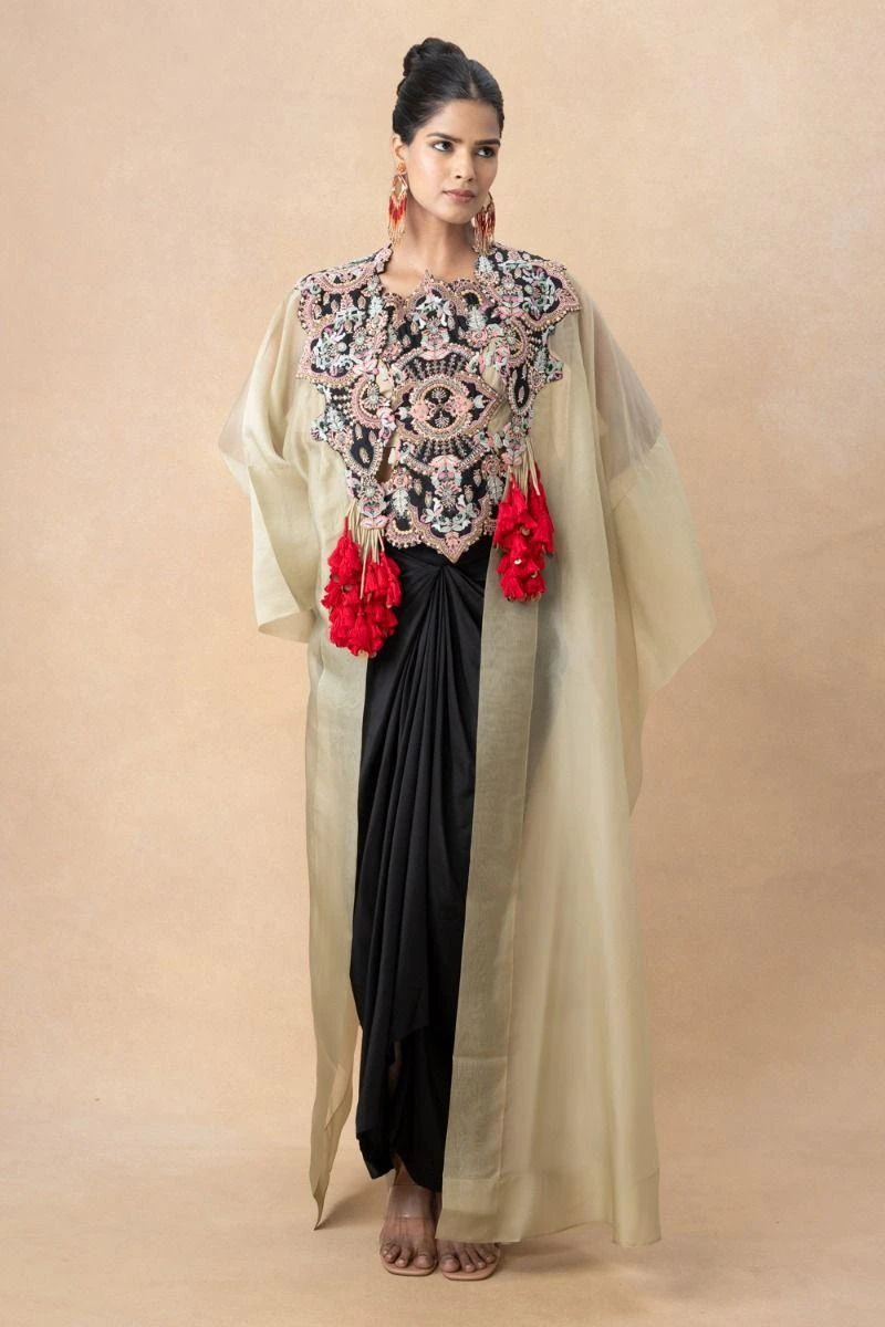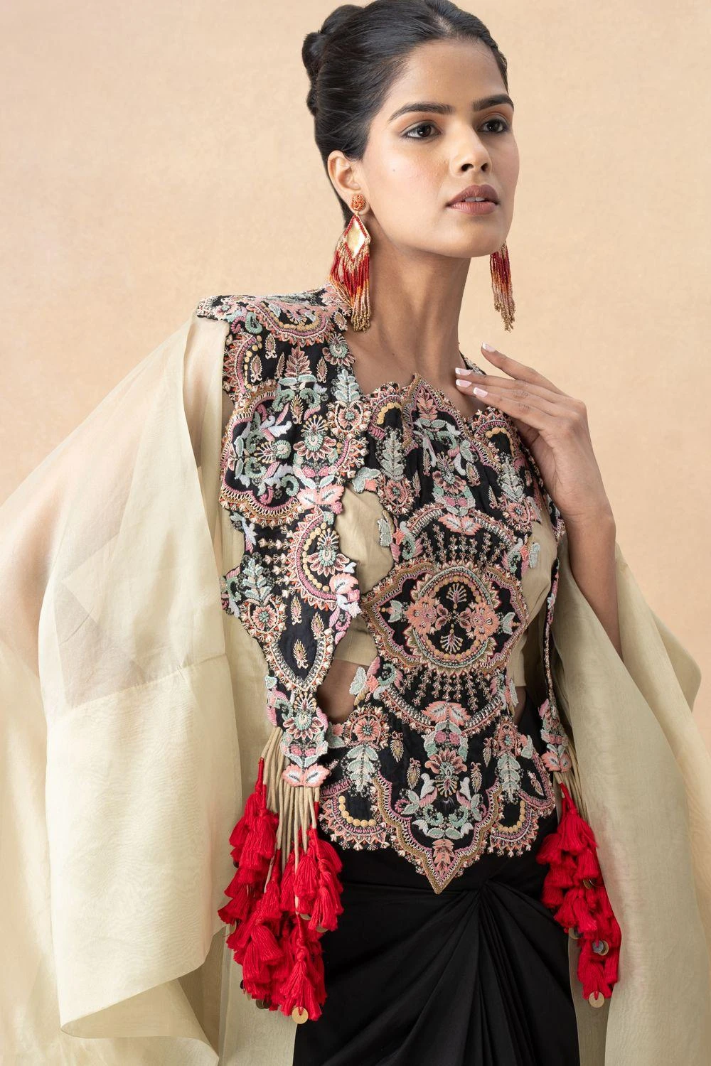 Contemporize your ethnic closet with this super chic & playful set. It features an embroidered cape paired with a top & a draped skirt. Adorn a pair of statement earrings and a clutch to complete the look.