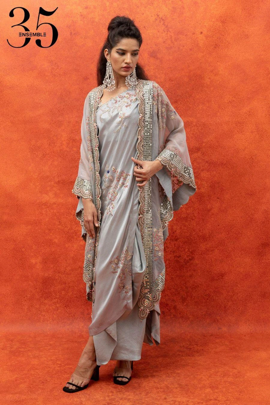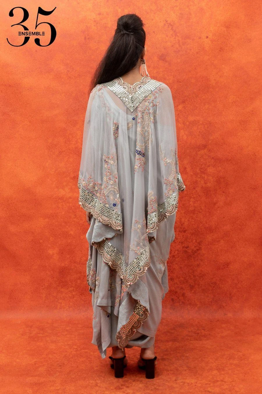 A yearlong celebration of its 35th anniversary telling the story of modern Indian fashion. Take the center stage in this eclectic cape set. It features a draped skirt paired with a bustier, a drape, and a mirror-embroidered cape.