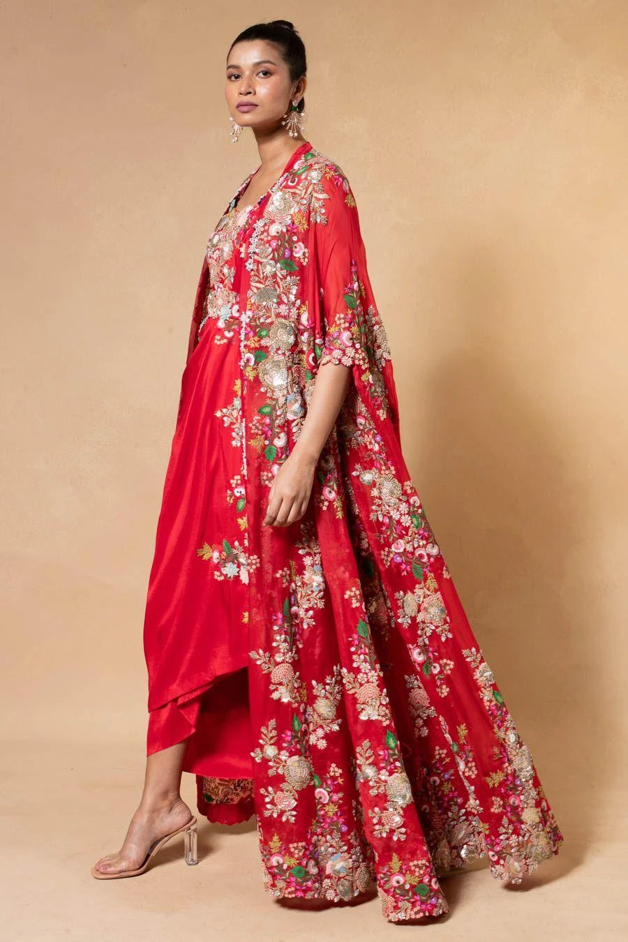 Look sartorially savvy with this cape set. Meticulously fashioned from sumptuous silk, this set showcases a lavishly ornamented cape, perfectly complemented by a gracefully draped skirt and an equally versatile bustier.