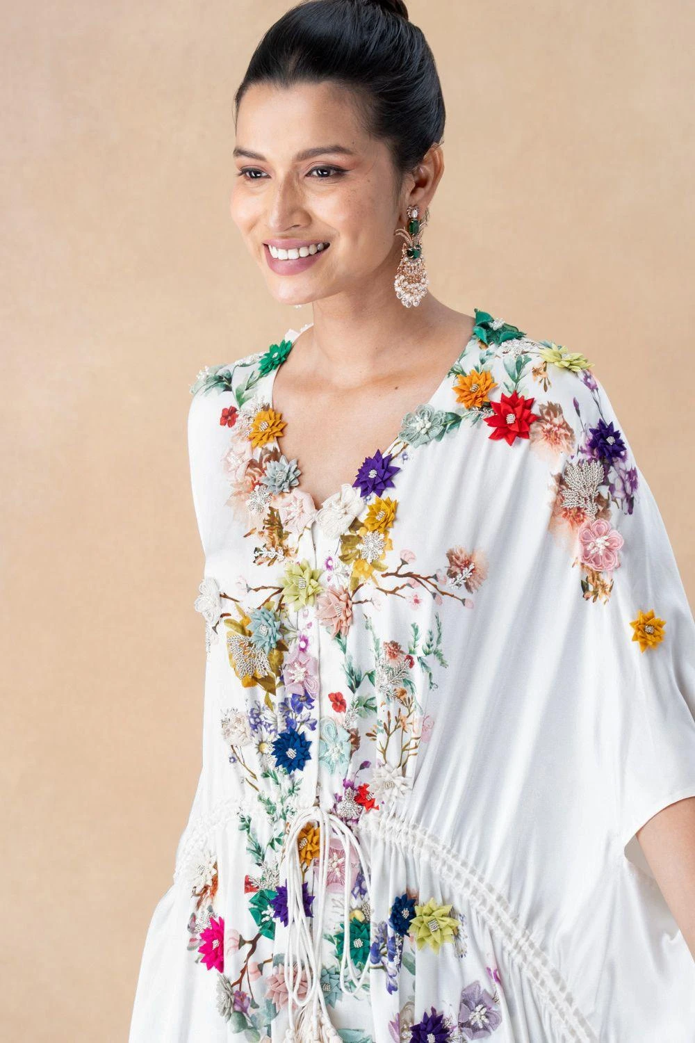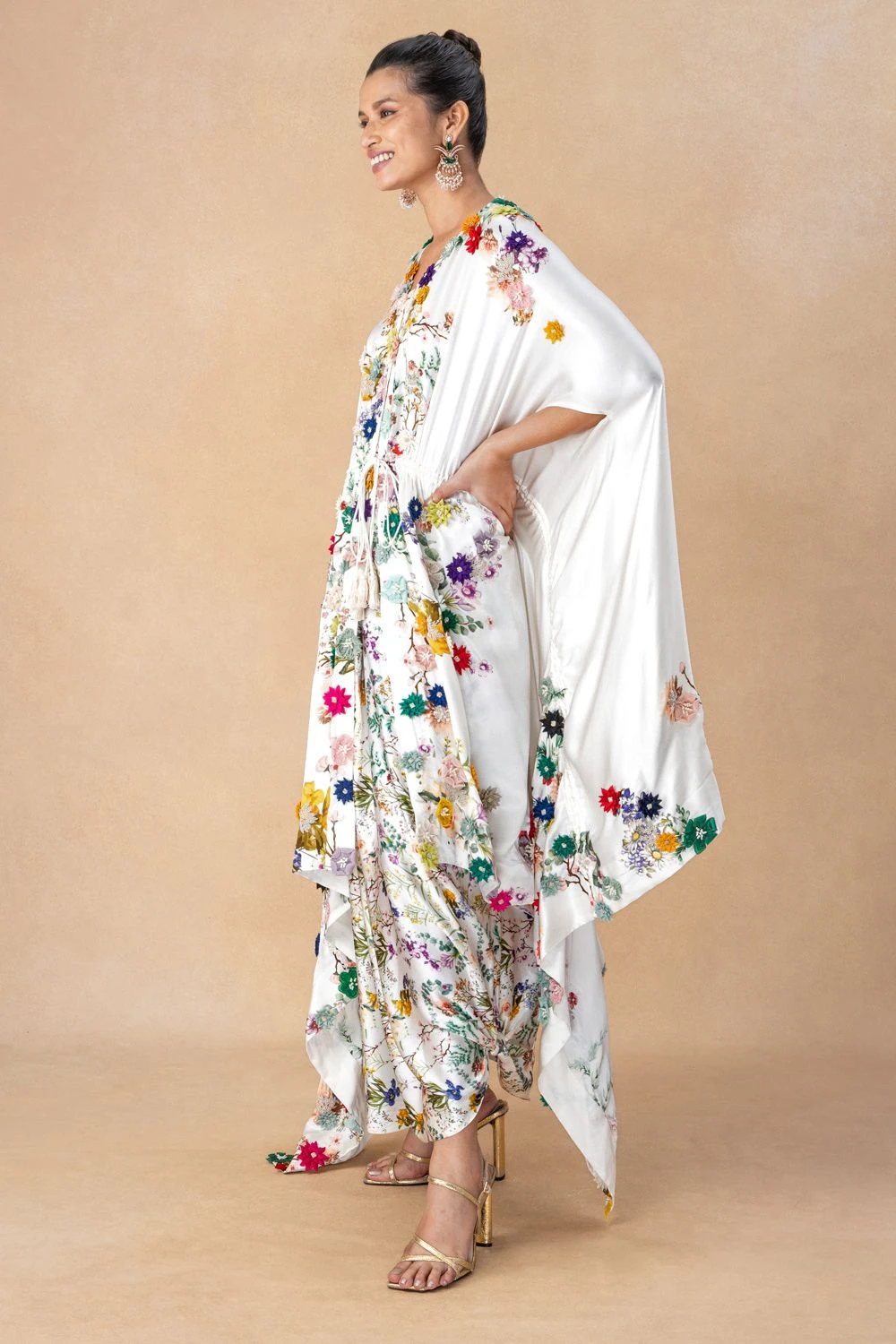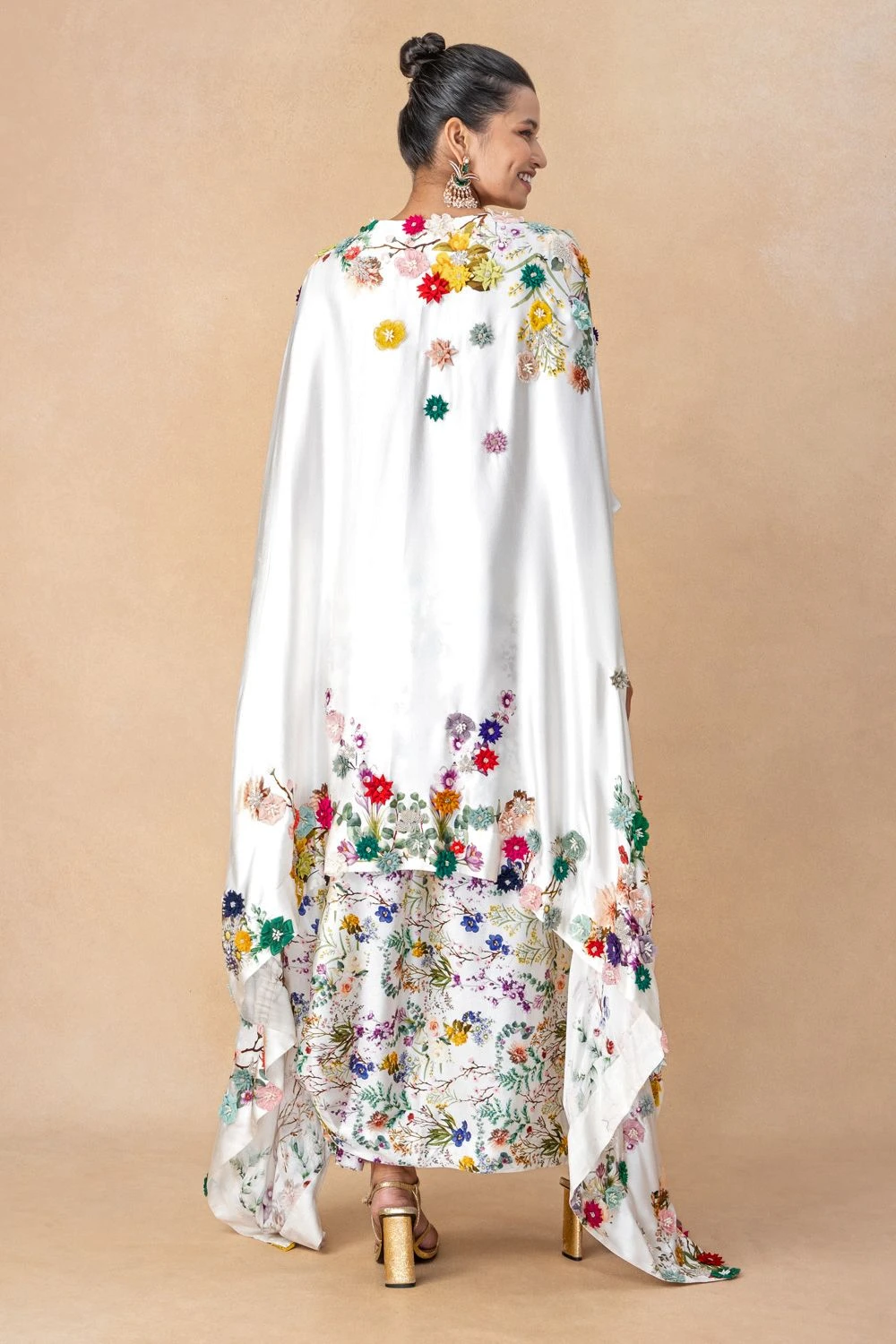 Elevate your elegance with this White Floral Embellished Cape Set. Adorned with delicate floral embellishments, this ensemble is a symbol of grace and sophistication.