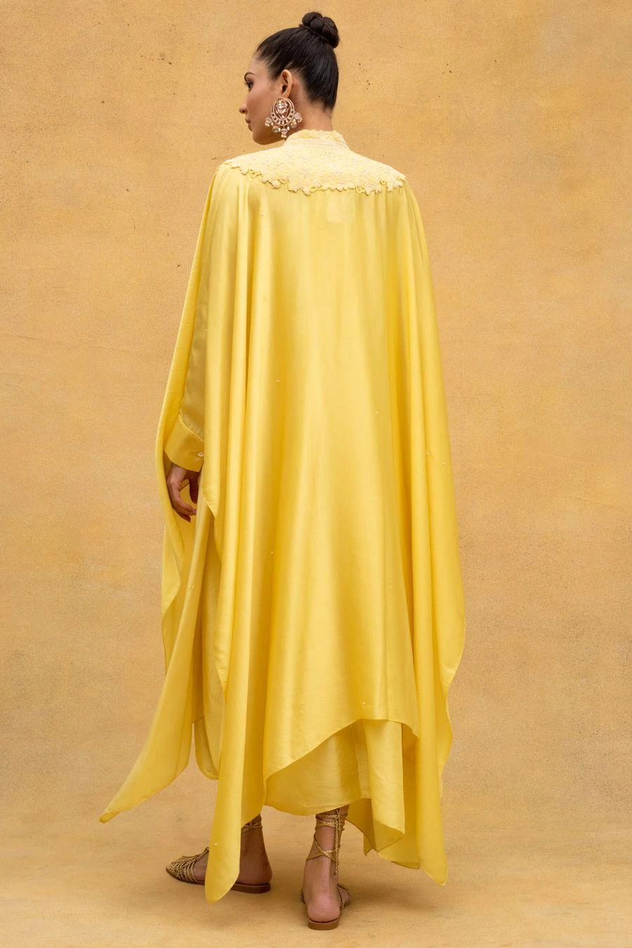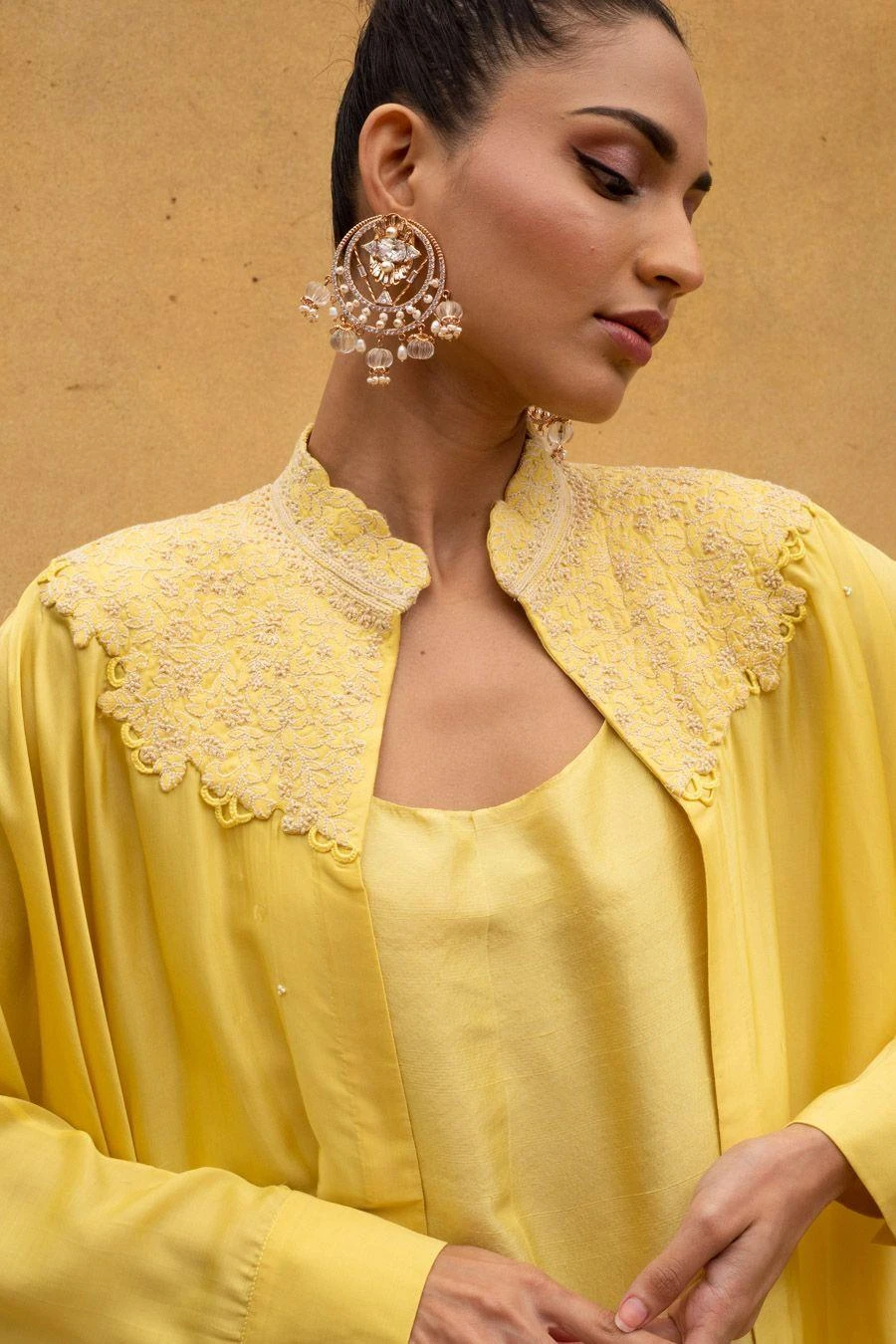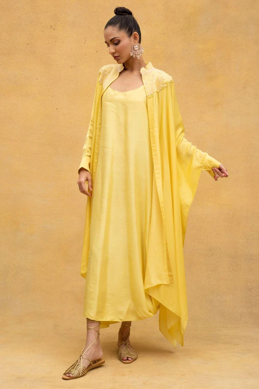 Contemporize your ethnic closet with this super chic & playful set. Crafted in silk, this set features a thread embroidered cape paired with a coordinated dress. Adorn a pair of statement earrings to complete the look.