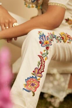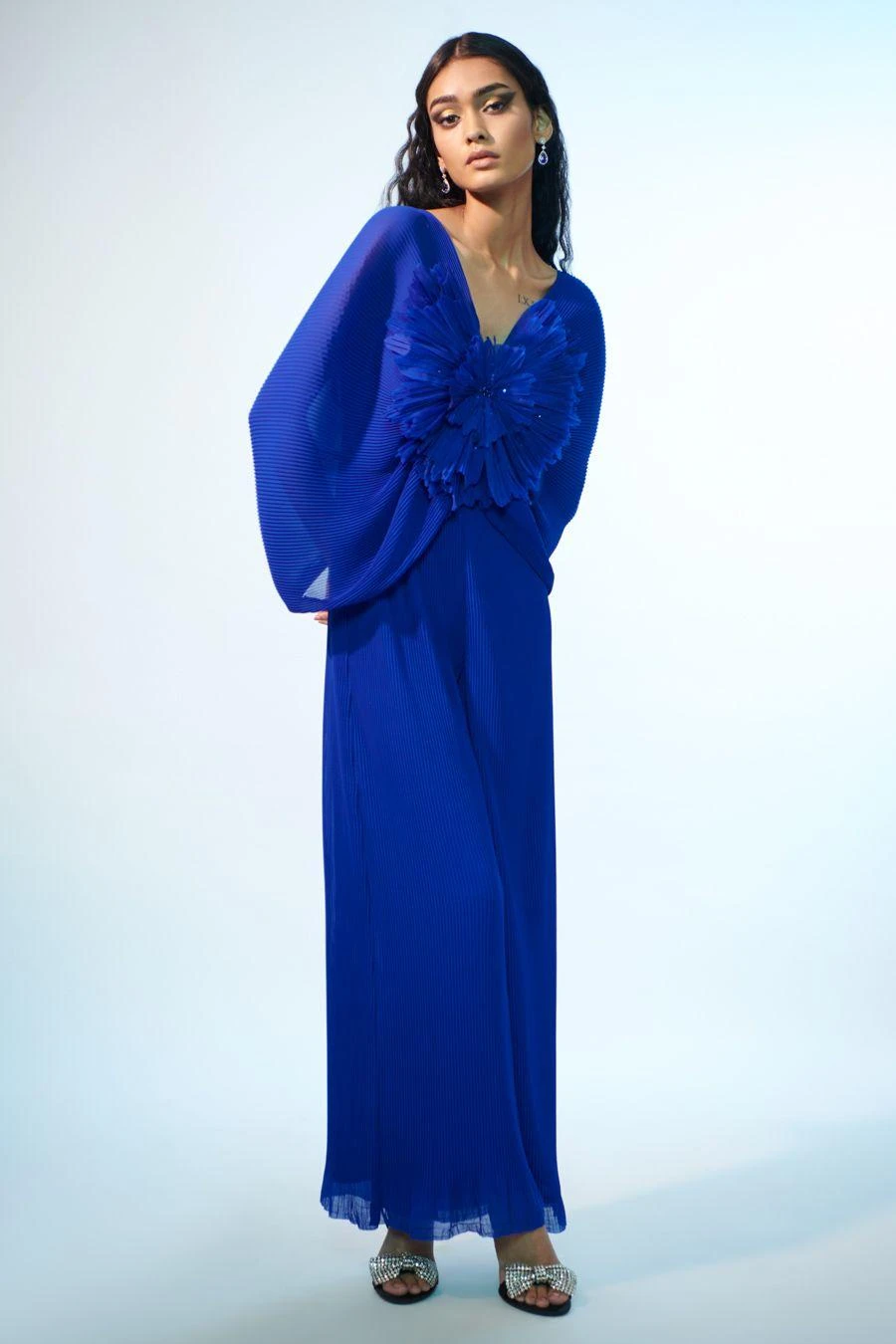 If you’re looking for a head-turning, statement-making jumpsuit that isn’t too heavy, this is the outfit for you. This jumpsuit is crafted in polyester pleated georgette and features a handmade organza sequinned flower.