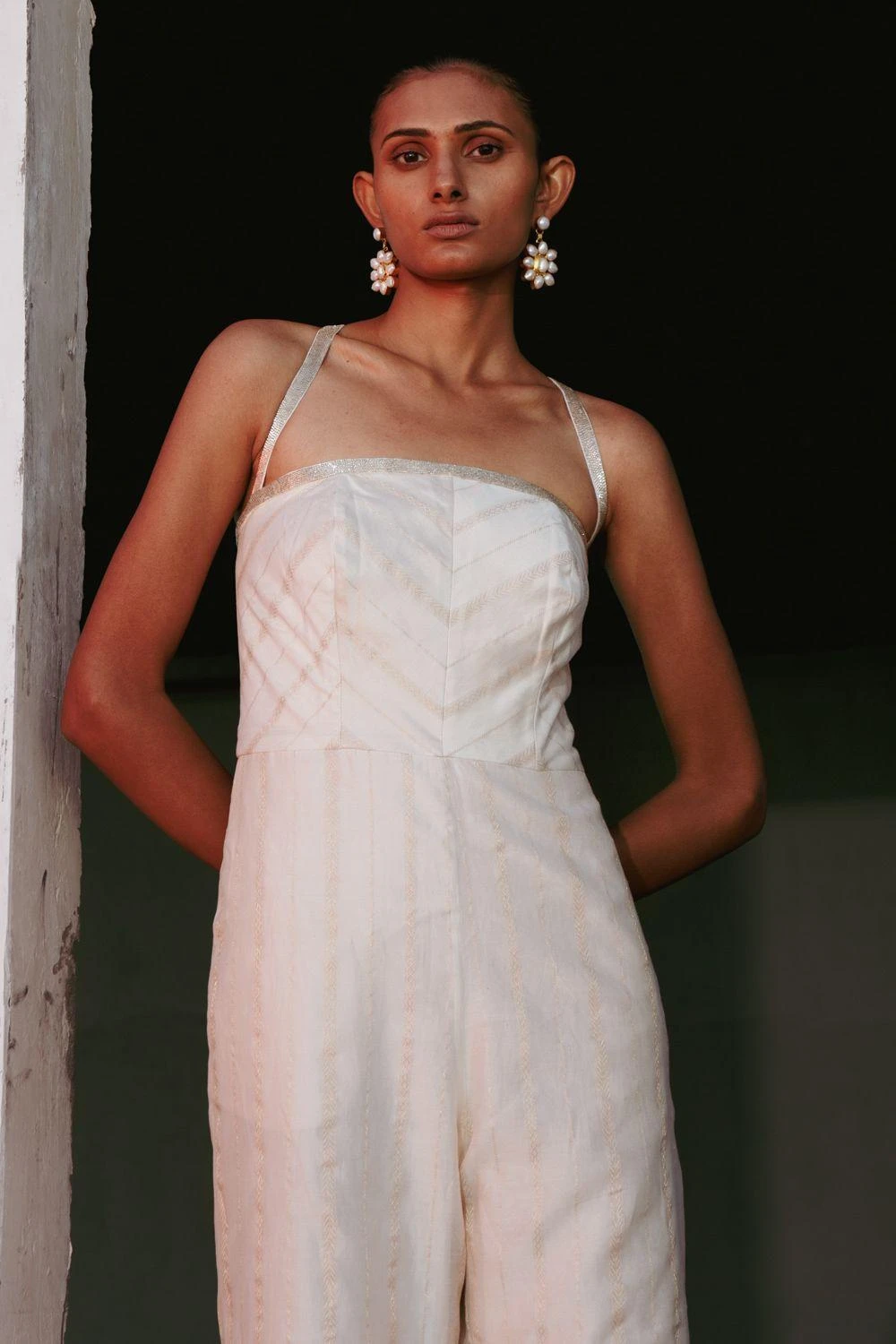 This jumpsuit will take you from AM to PM in no time. Crafted in woven silk, this jumpsuit features an embellished halter neckline. Style it with a pair of statement earrings & stack of bracelets to complete the look.