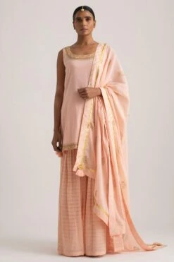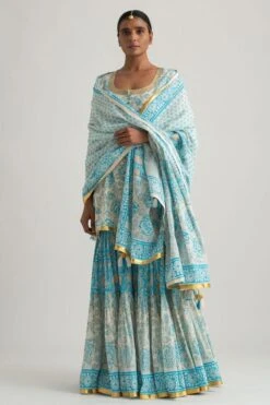Make an exceptionally stylish wedding guest at your next destination wedding in this ivory cape set. Crafted in organza & silk, this set features a sharara paired with a hand embroidered blouse & a coordinating cape.