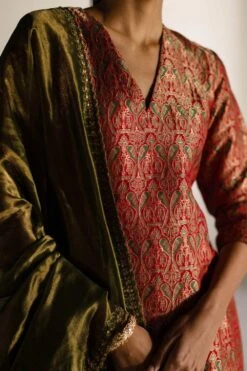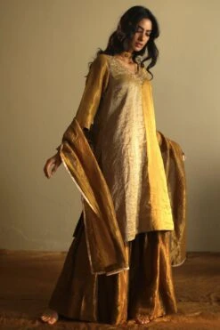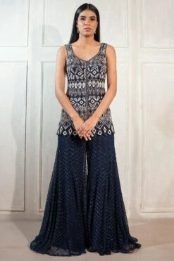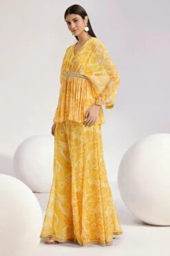 Arpita Mehta’s take on the classic sari silhouette is both fun and feminine, making it the perfect choice for the bridesmaid. Crafted in organza & silk, this set comes with a green garden print sharara paired with a hand embroidered drape & blouse.