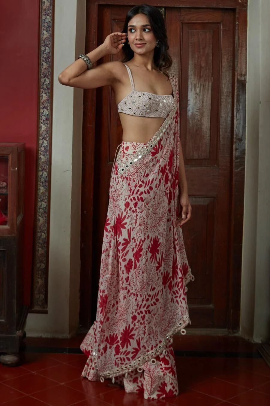 Arpita Mehta’s take on the classic sari silhouette is both fun and feminine, making it the perfect choice for the bridesmaid. Crafted in organza & silk, this set comes with a red garden print gharara paired with a hand embroidered drape & blouse.