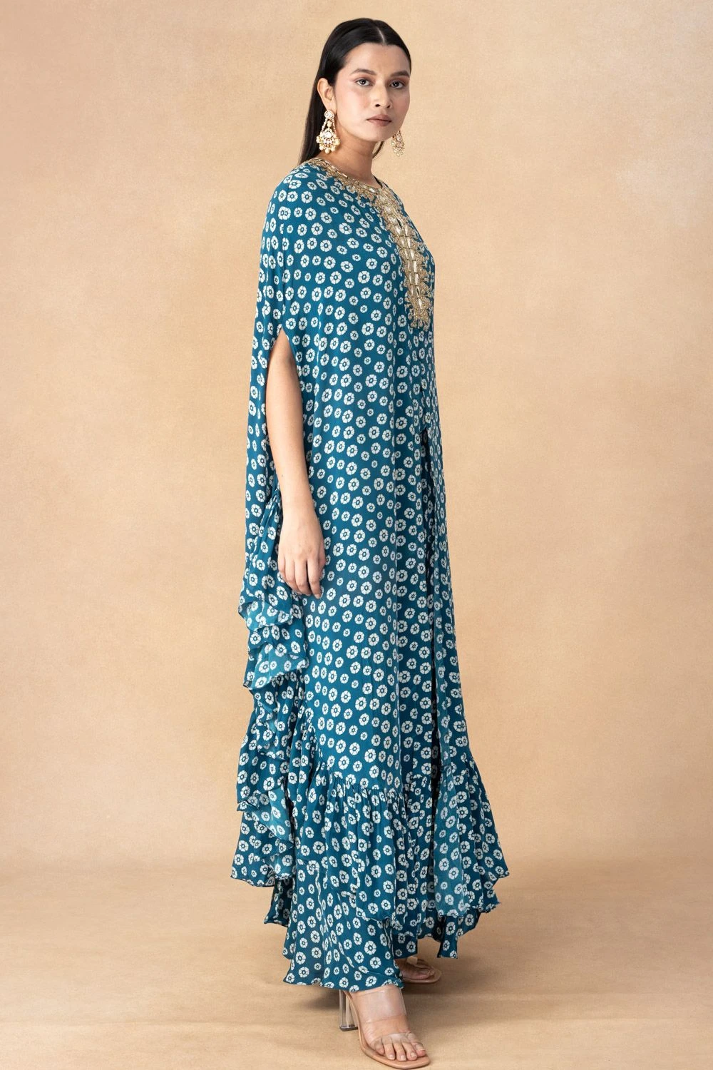 Step into opulent elegance with this hand-embroidered cape set. This ensemble is a testament to the perfect fusion of intricate craftsmanship and modern sophistication, setting the stage for a remarkable look.