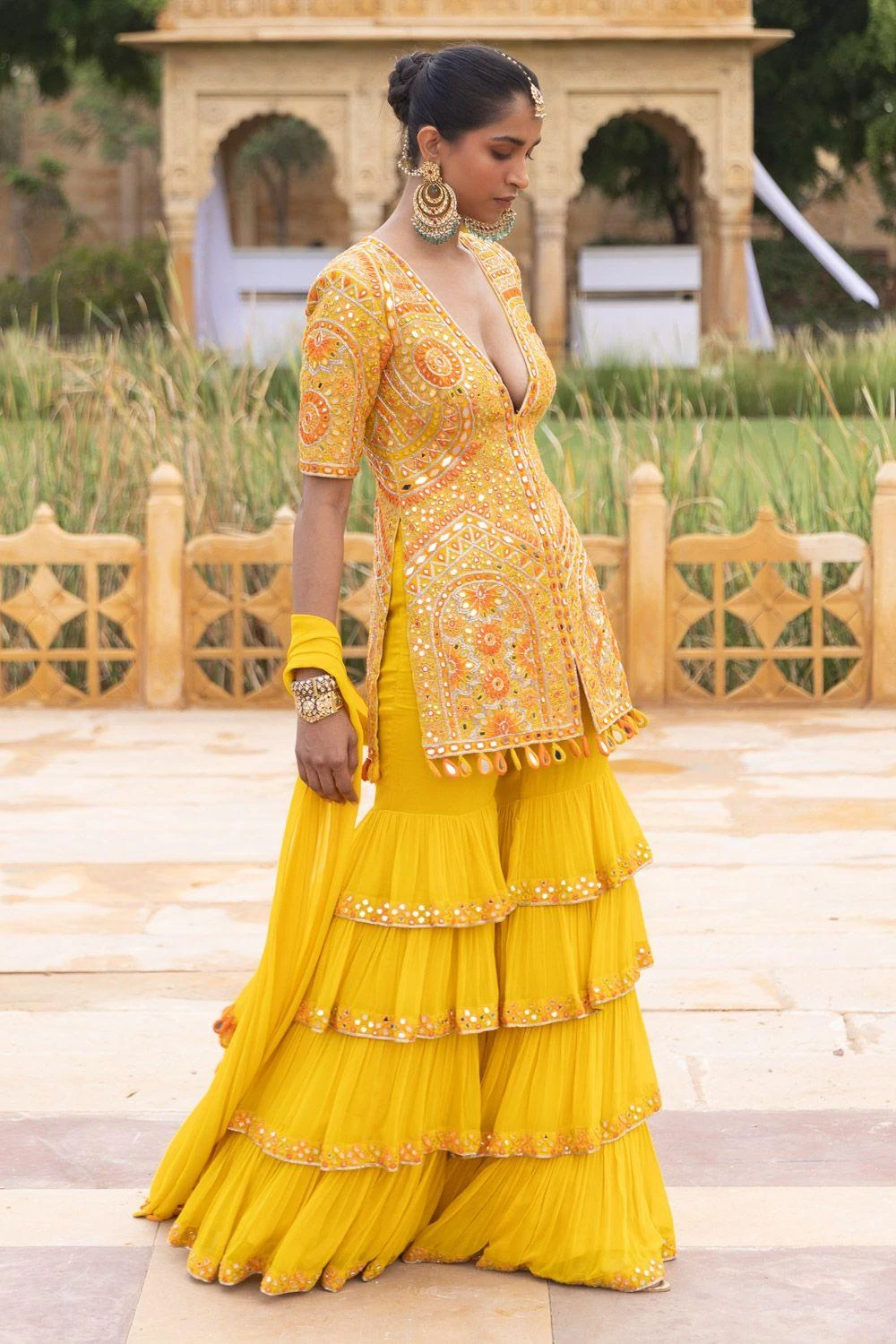 Step into opulent elegance with this Yellow hand-embroidered sharara set. This ensemble is a testament to the perfect fusion of intricate craftsmanship and modern sophistication, setting the stage for a remarkable look.
