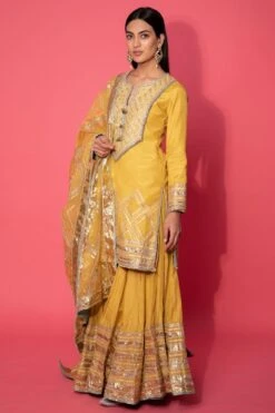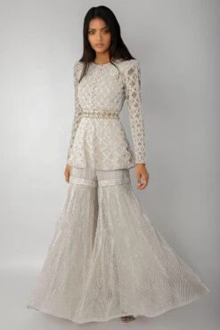 Take the centre stage in this eclectic mitra sharara set. It features a short crepe V neck kurta adorned with mirror work & cowry shells. It is well paired with a pair of matching flare sharara pants.