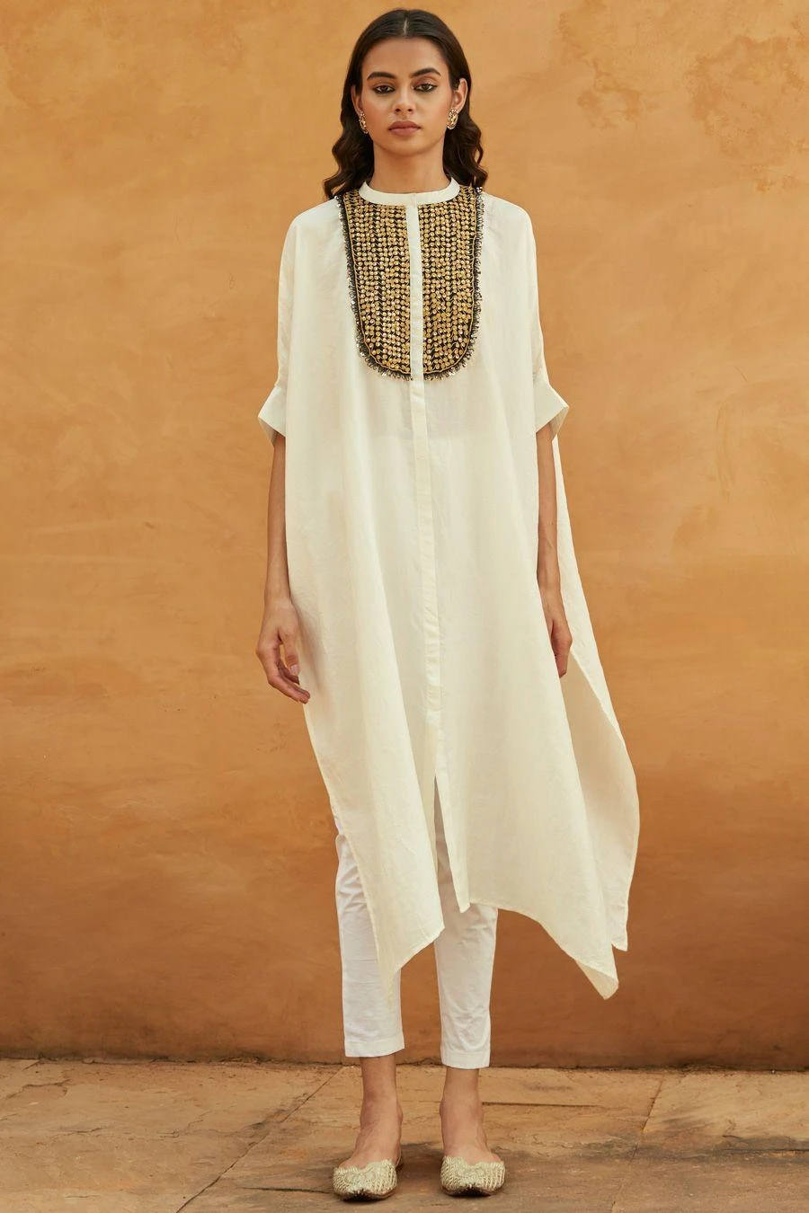 The perfect amalgamation of style & comfort, this kaftan set is perfect for a day out. This kaftan features a black yoke with marodi work & sequence trim detailing paired with cotton lycra pants. Style it with dainty jewellery to complete the look.