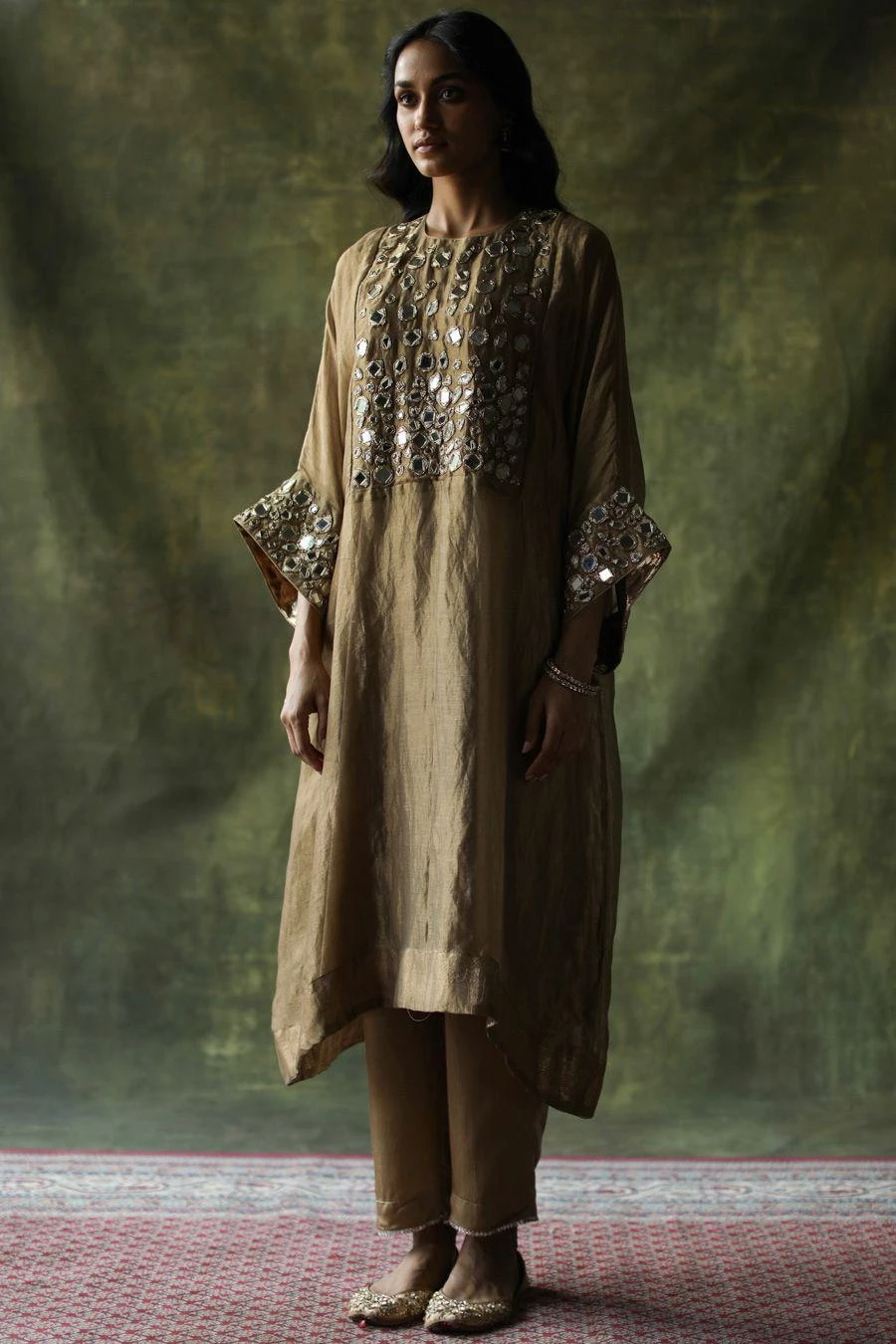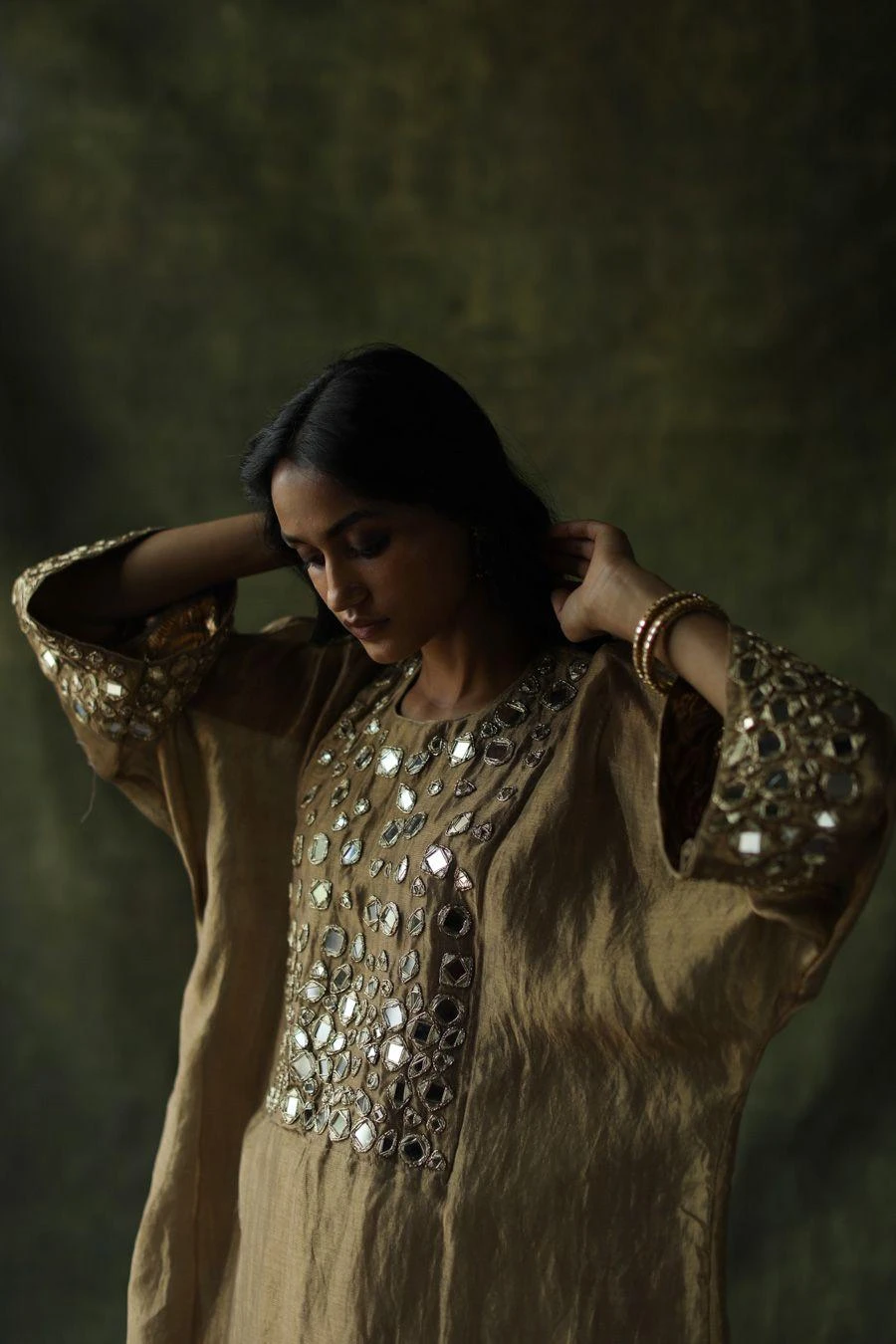 This heavily embellished kaftan set will see you through all kinds of festivities. Crafted in silk & satin, this set comes with a kaftan with heavily embellished mirror work across the yoke with tapered sleeves paired with straight fit pants.