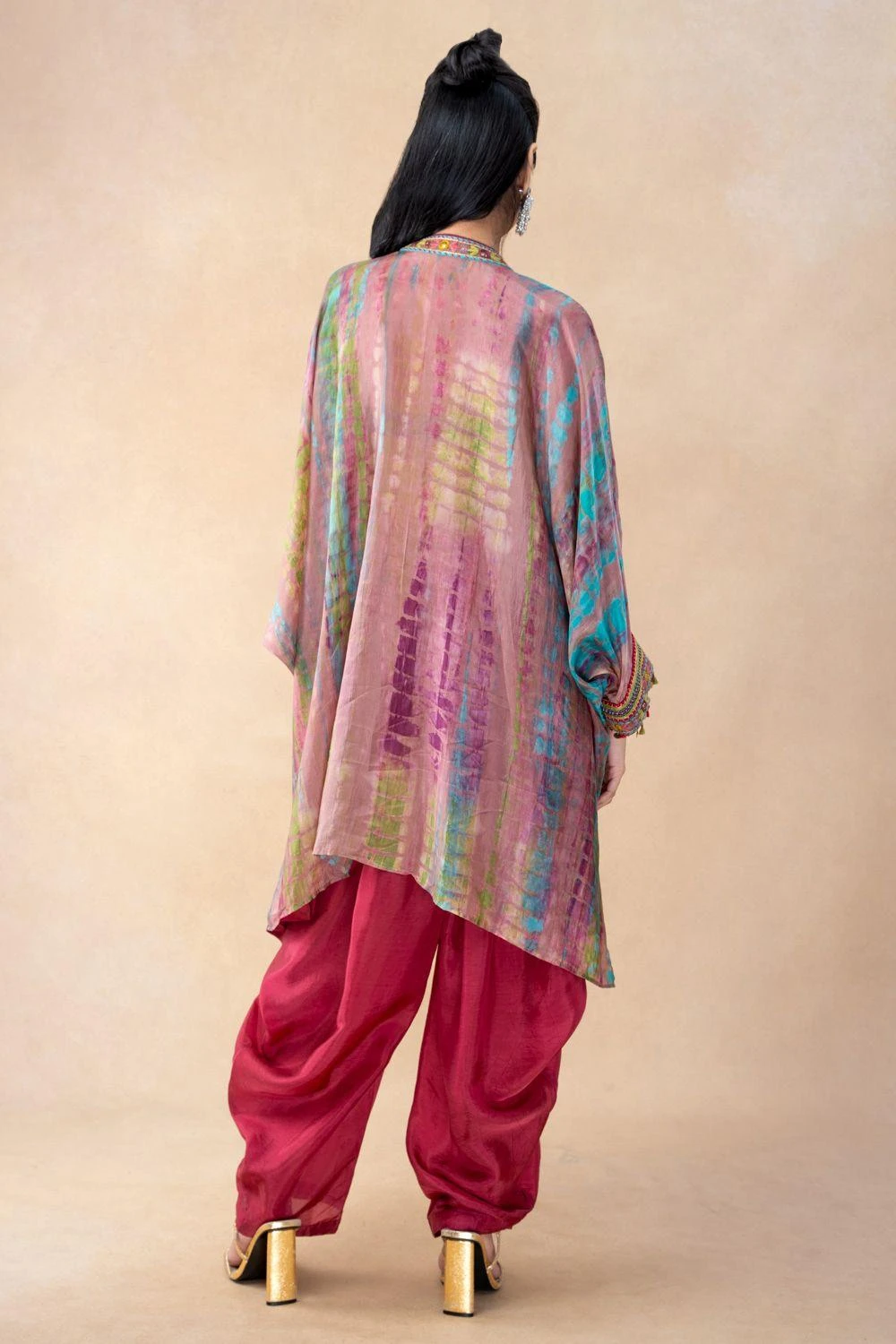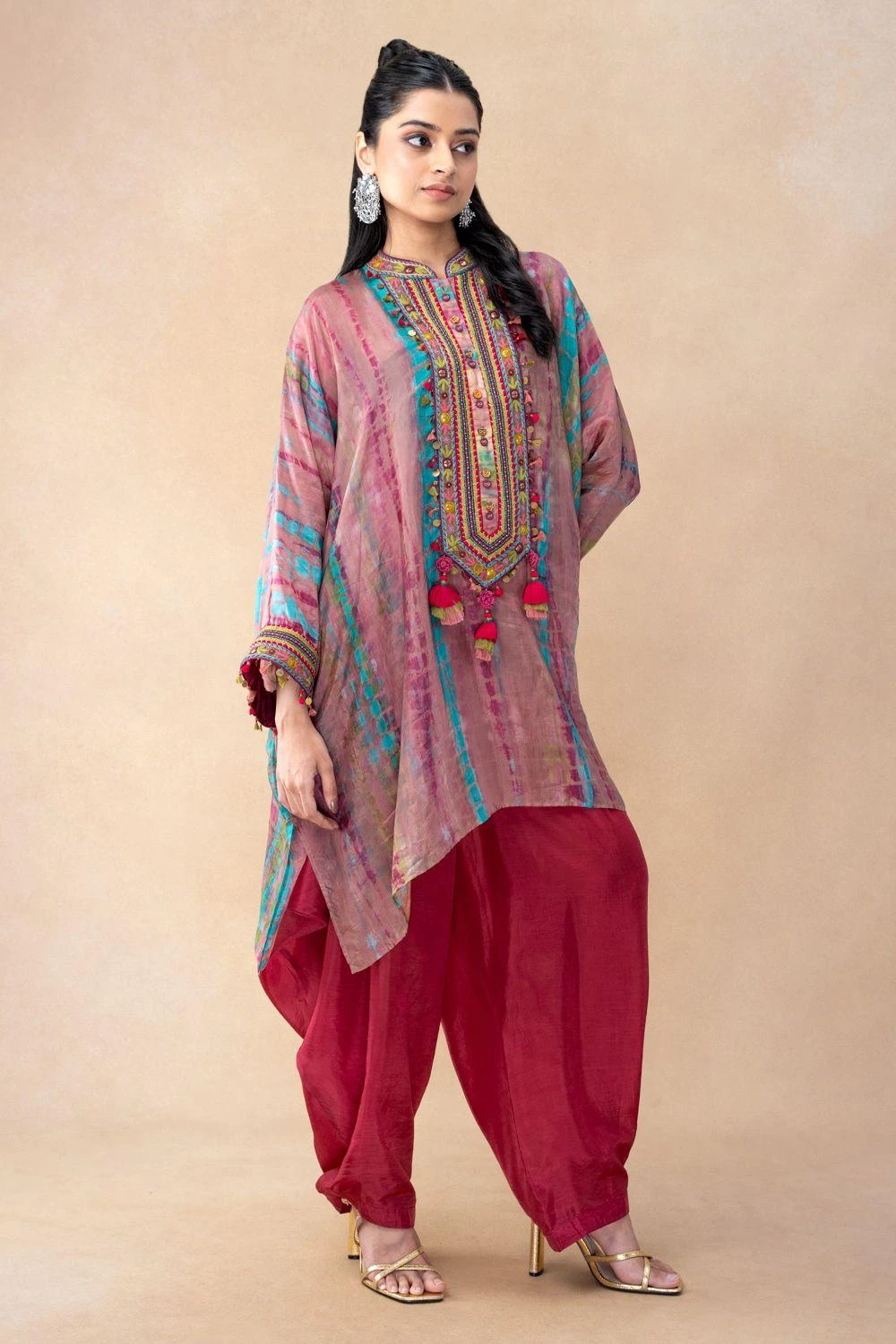 Look effortlessly stylish with this embellished band collar kaftan tunic, paired harmoniously with dhoti pants. This ensemble reflects refined style and grace, capturing attention effortlessly with its blend of modernity and tradition.