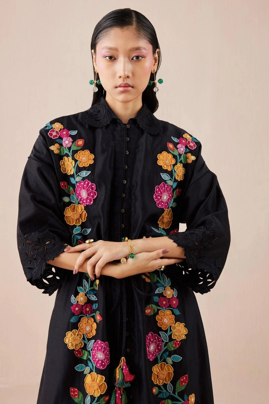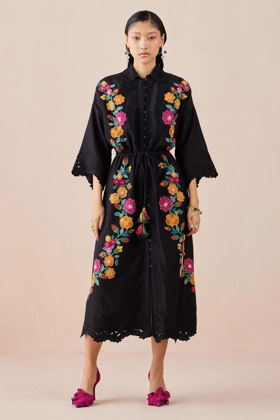 From your work desk to the brunch table & from lounging at home to catching flights, you can always count on this dress. This black chanderi applique and beadwork shirt dress features cutwork details.