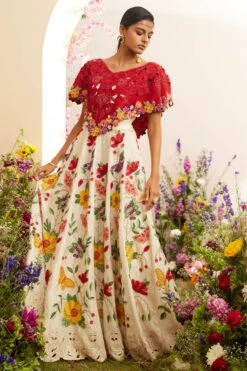 Maximise the life of your wardrobe with this poncho. Crafted in chanderi, this bustier features intricate beadwork & cutwork details. Pair it with the Ivory chanderi floral applique lehenga from the collection for an effortless daytime look.