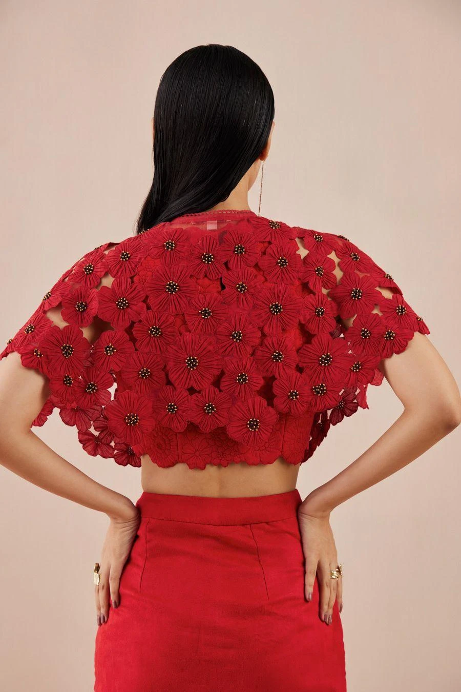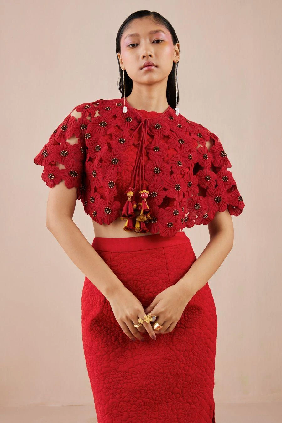 Take your layering game a notch higher with this cropped jacket. Crafted in organza, this ped poppy applique and cutwork organza cape features beadwork details. Style this cape with a quilted top & skirt from the collection to complete the set.