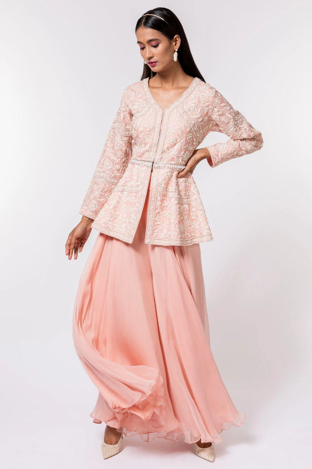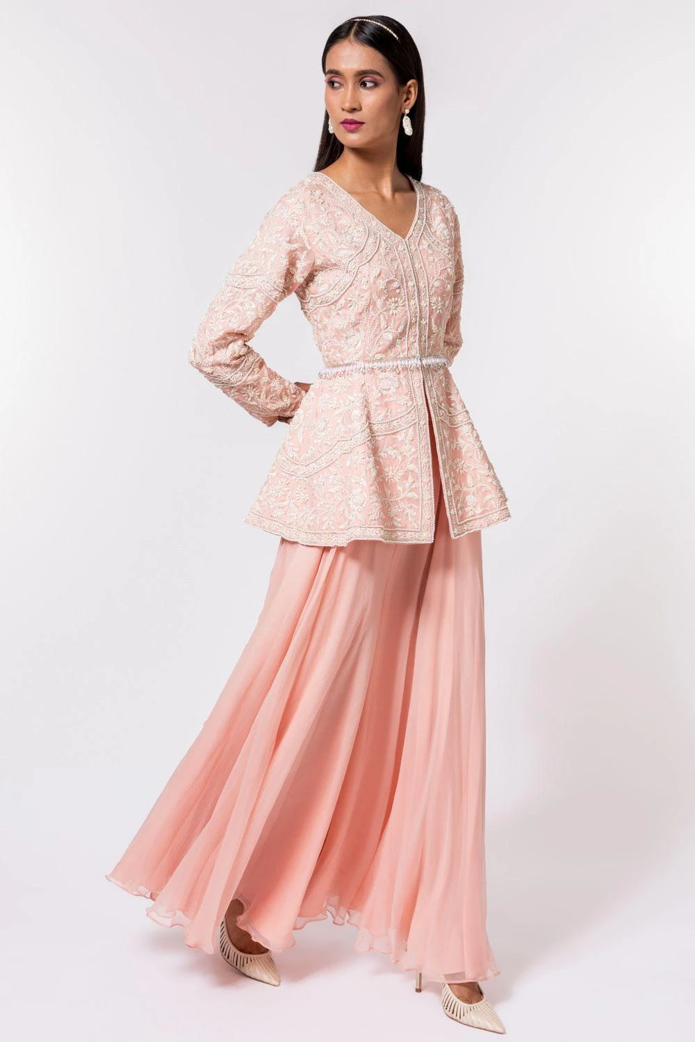 This elegant powder pink sharara set comes with a fully embroidered peplum blouse & a flowy organza sharara. Style this graceful set with a pair of pearl earrings and a potli to complete the look.