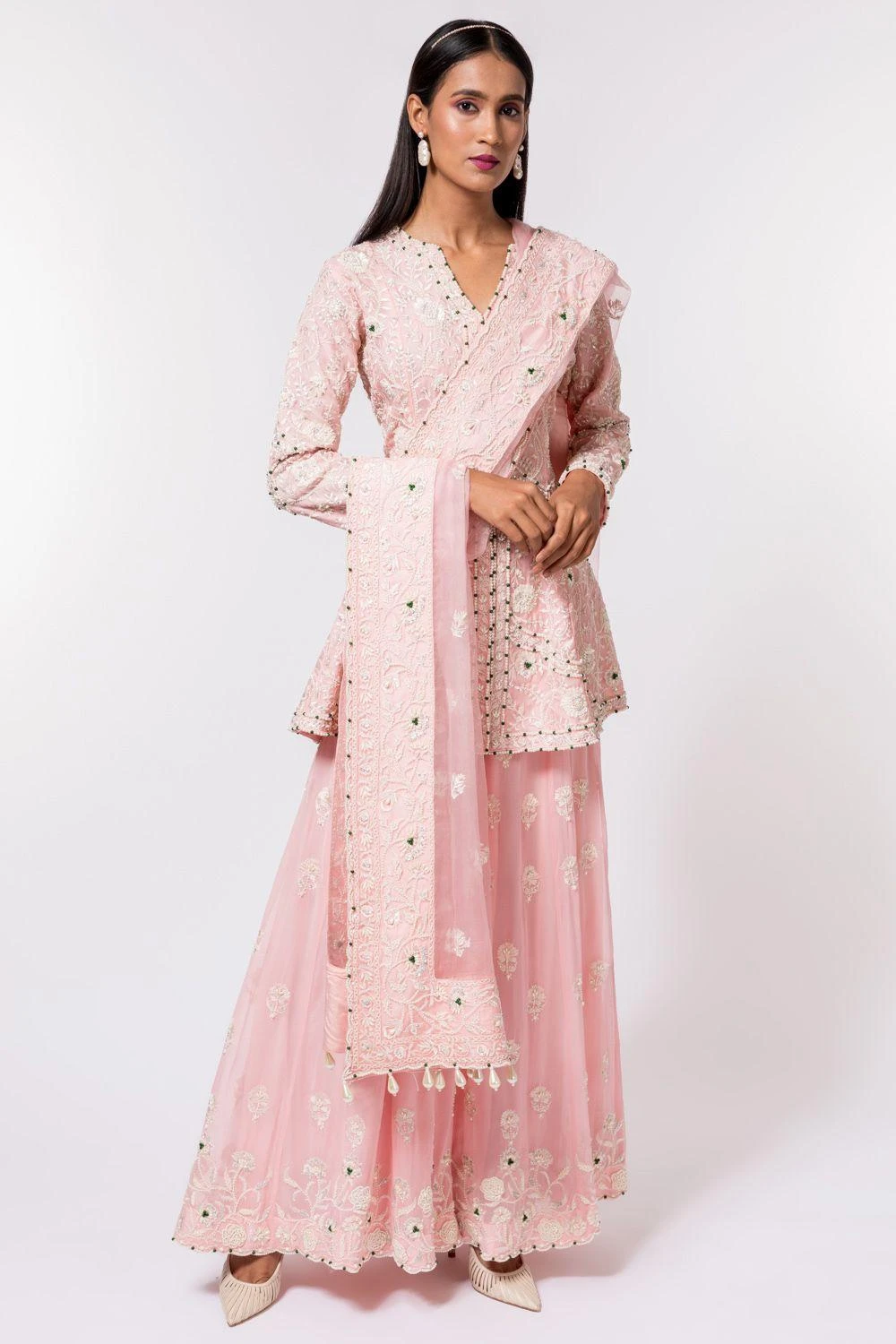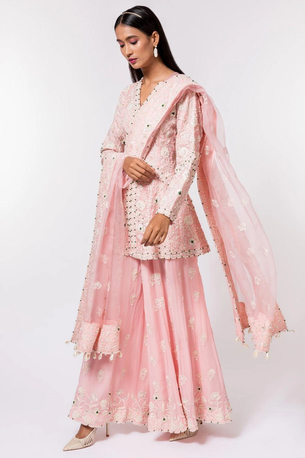 This elegant pink sharara set is perfect for daytime wedding festivities. The set is intricately embroidered with threadwork & emerald green beads. Style this timeless piece with elegant earrings and a clutch to complete the look.