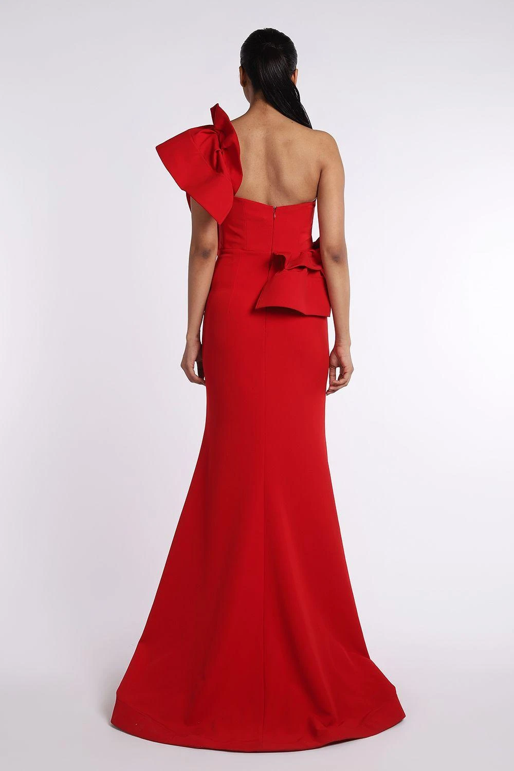 In a bold red, this one shoulder, slim mermaid gown has all the dramatic details to make a statement.
