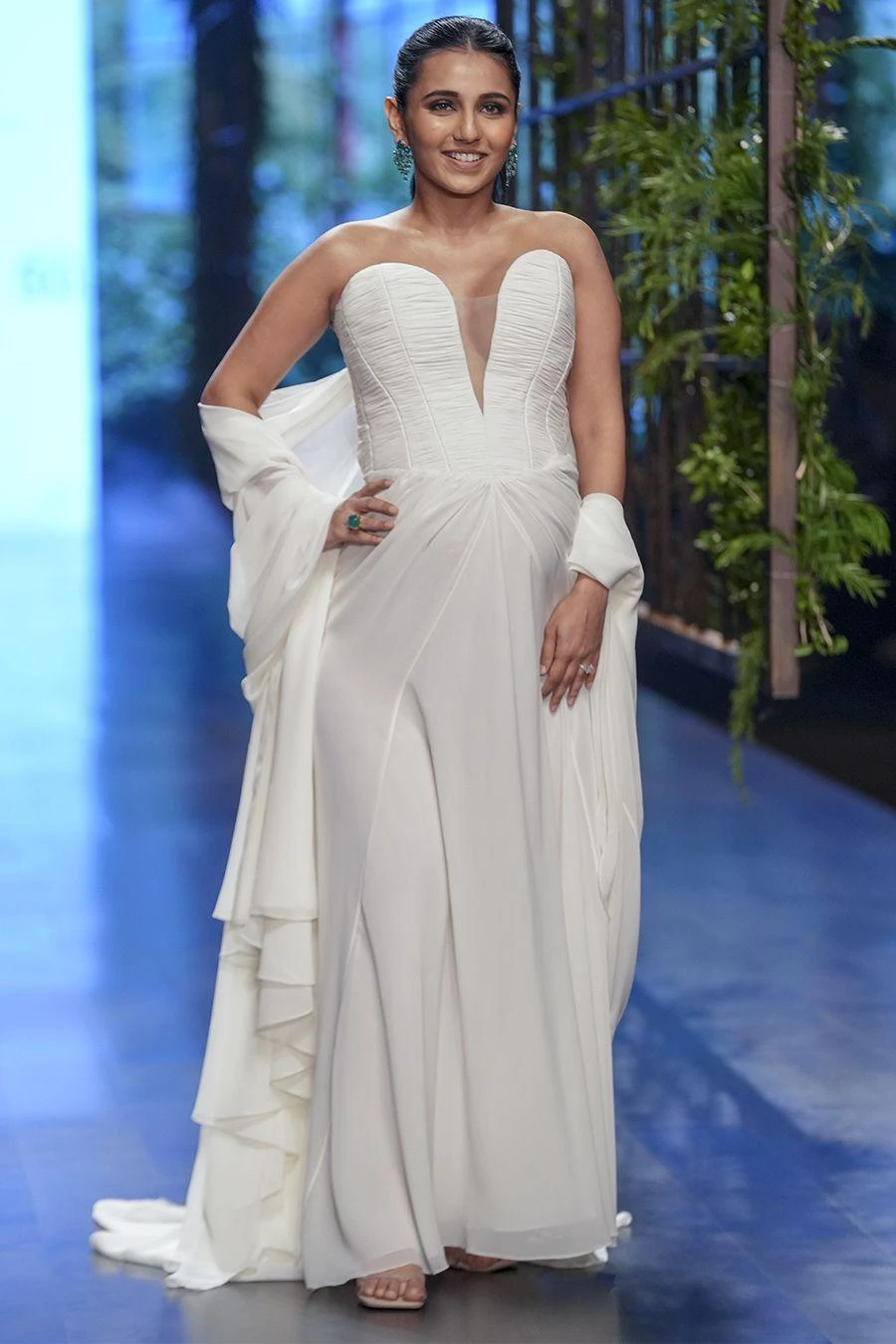 This is the gown for you if you want a head-turning statement-making gown that isn’t too heavy. Crafted in viscose georgette, this Grecian inspired white fluted gown features a plunge neck and a corseted bodice.
