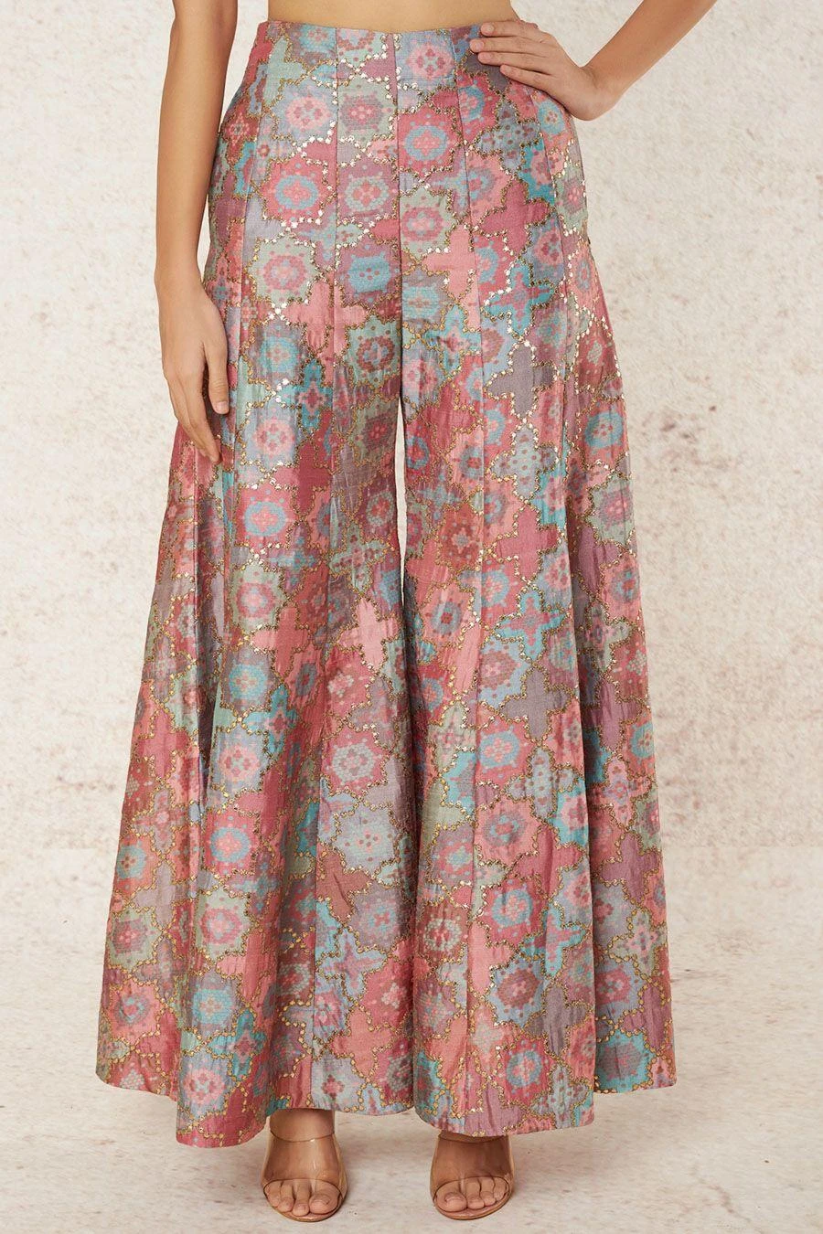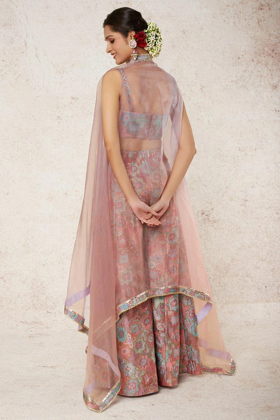 Swap your dupattas for capes this festive season. Crafted in silk, this set features a panelled sharara with a strappy choli embellished with mirrors and tassels and an organza cape. Add a pair of statement earrings to complete the look.