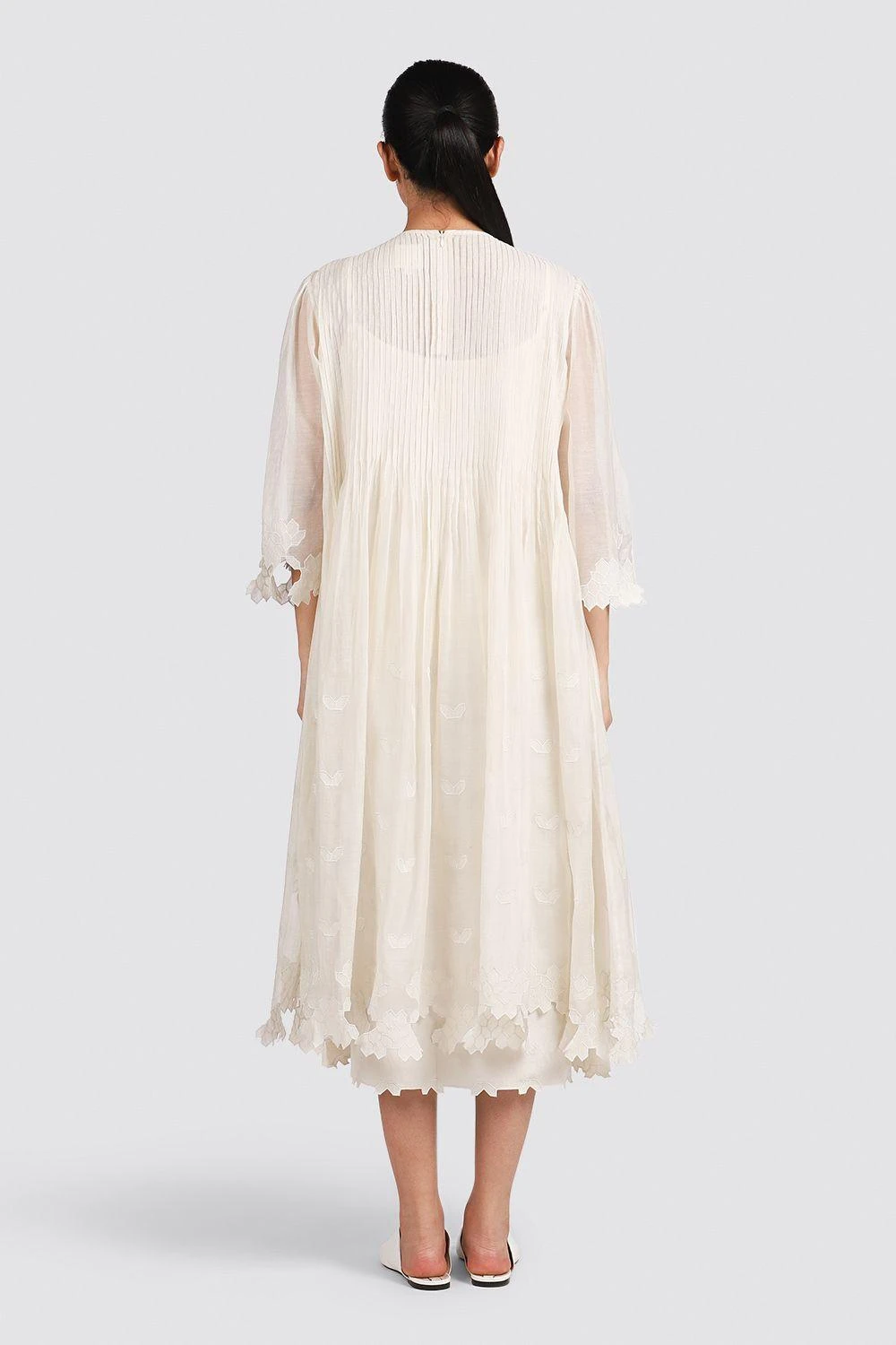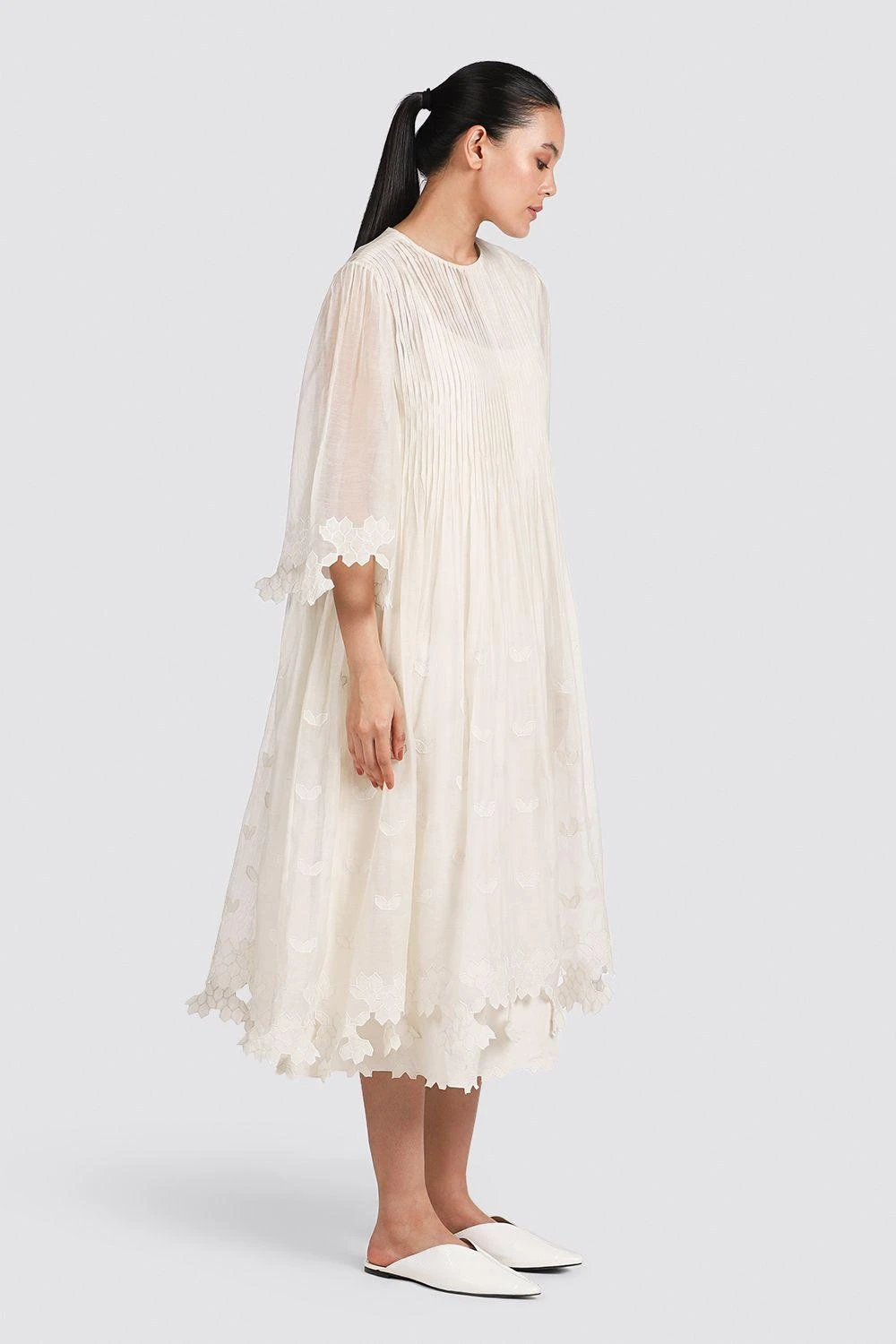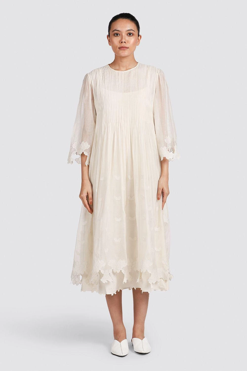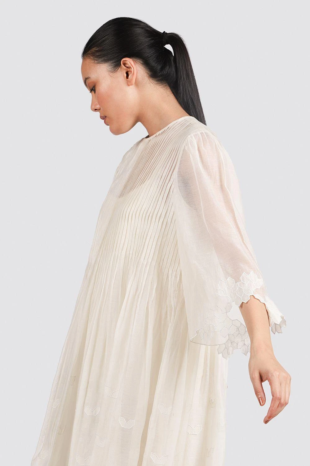 This pleated calf length ivory dress with cutwork on the sleeve edges and hem is fresh, pretty & comfortable for a long summer day. Wear it with fun tie-up gladiator sandals.