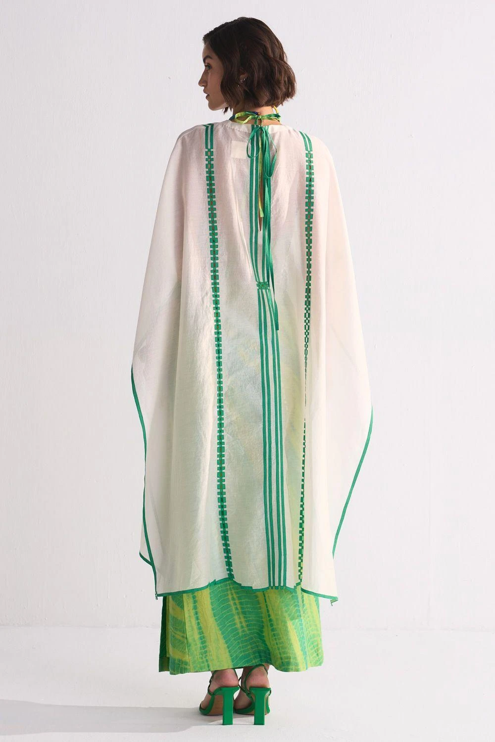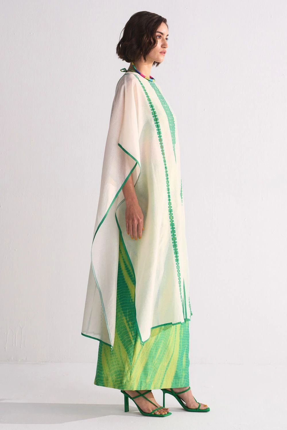 Enriched with artisanal flair and crafted from exquisite chanderi fabric, this resplendent geometric applique kaftan exudes a timeless charm that effortlessly blends traditional beauty with contemporary chic.