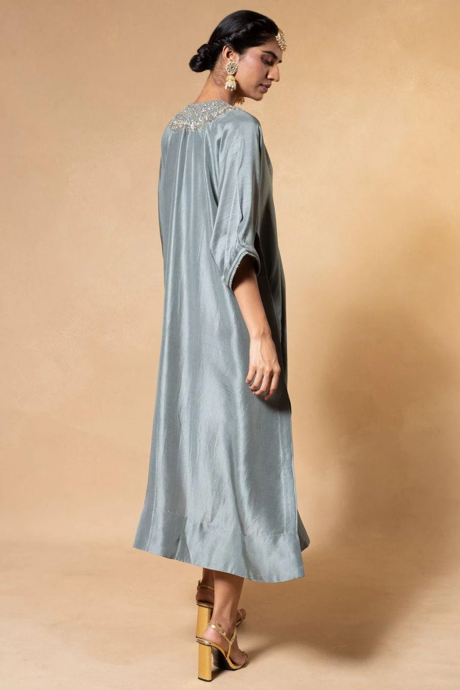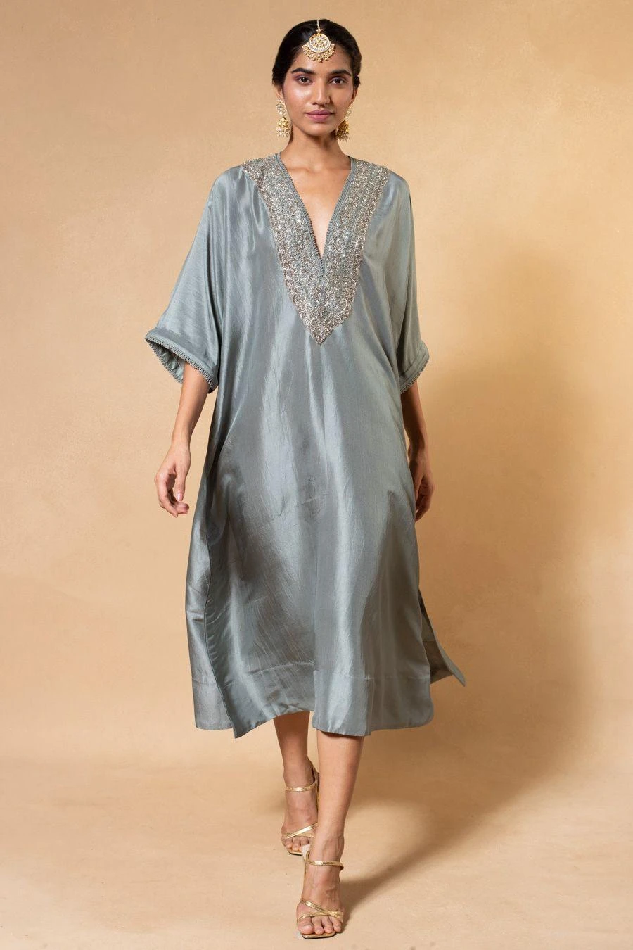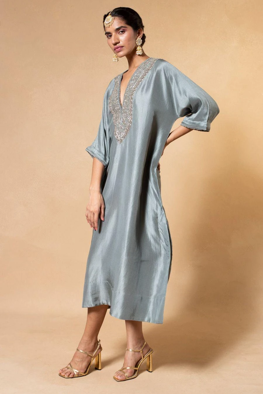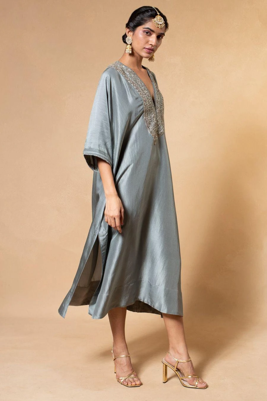 A true masterpiece of artisanal craftsmanship, this kaftan is a celebration of the ancient art of zardosi embroidery, where gleaming gold threads are meticulously woven into sumptuous fabrics.