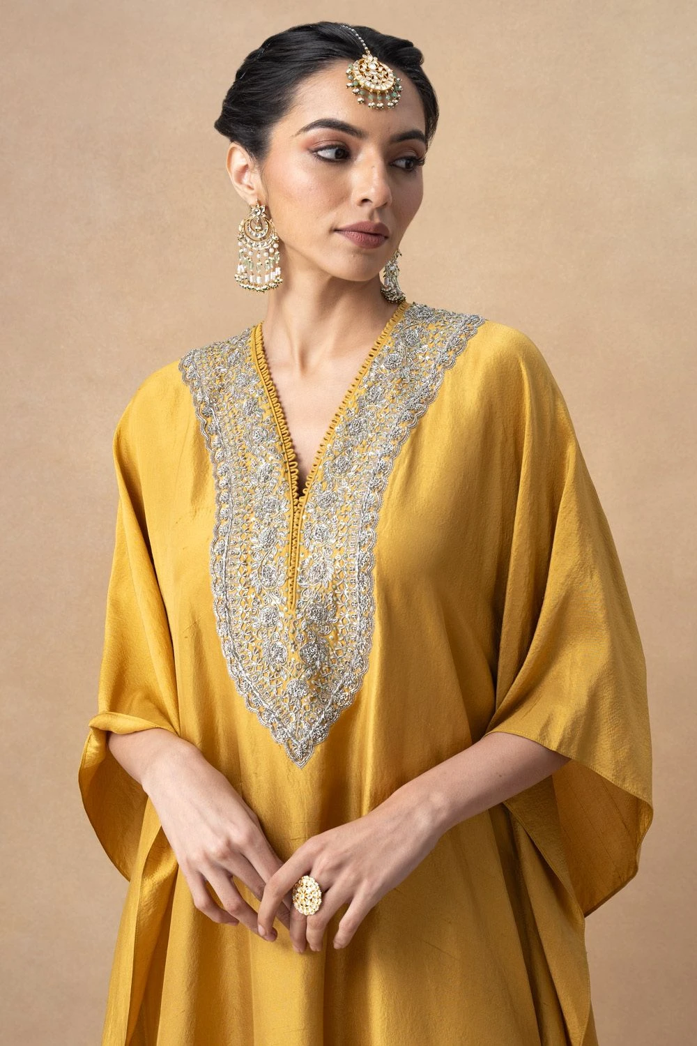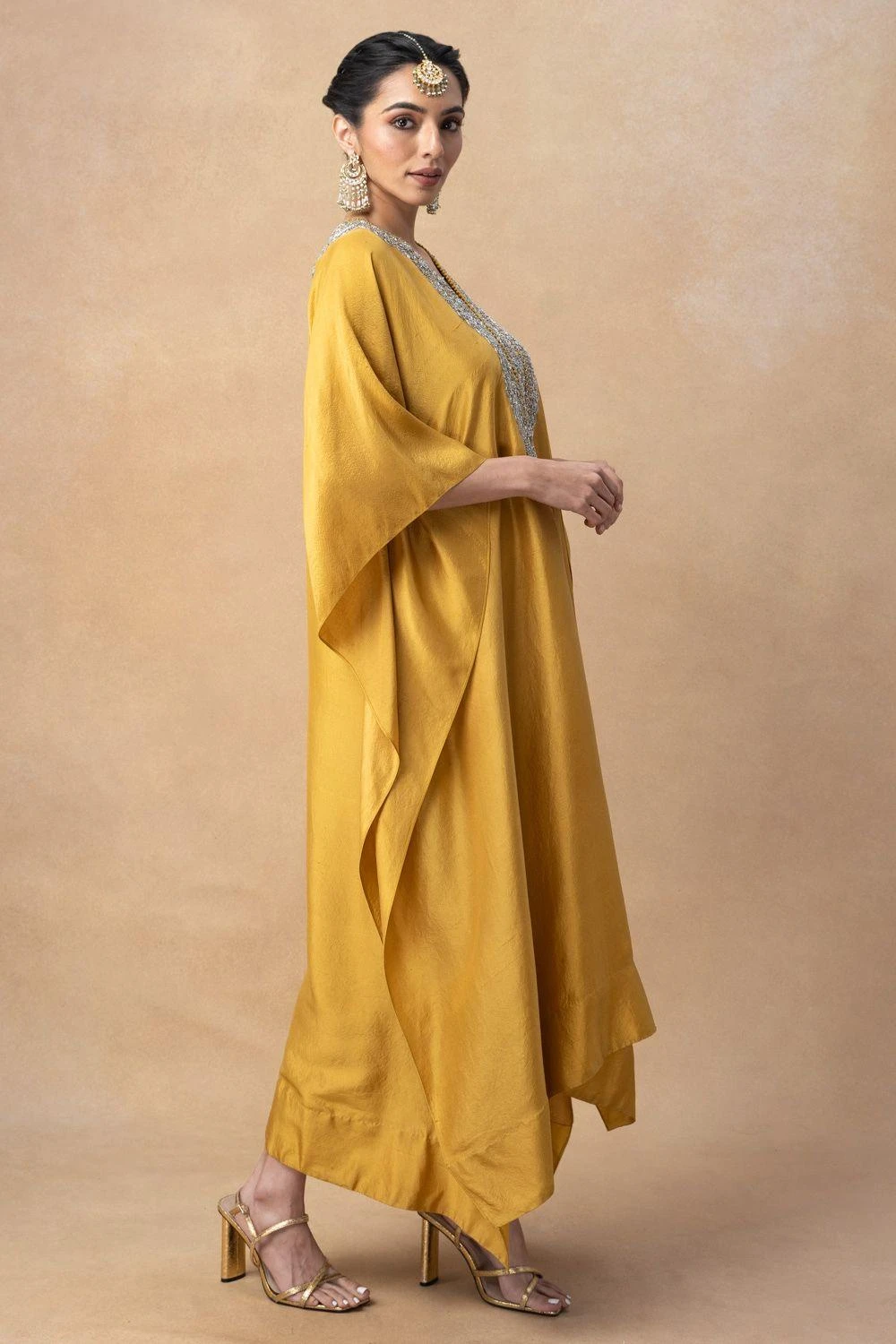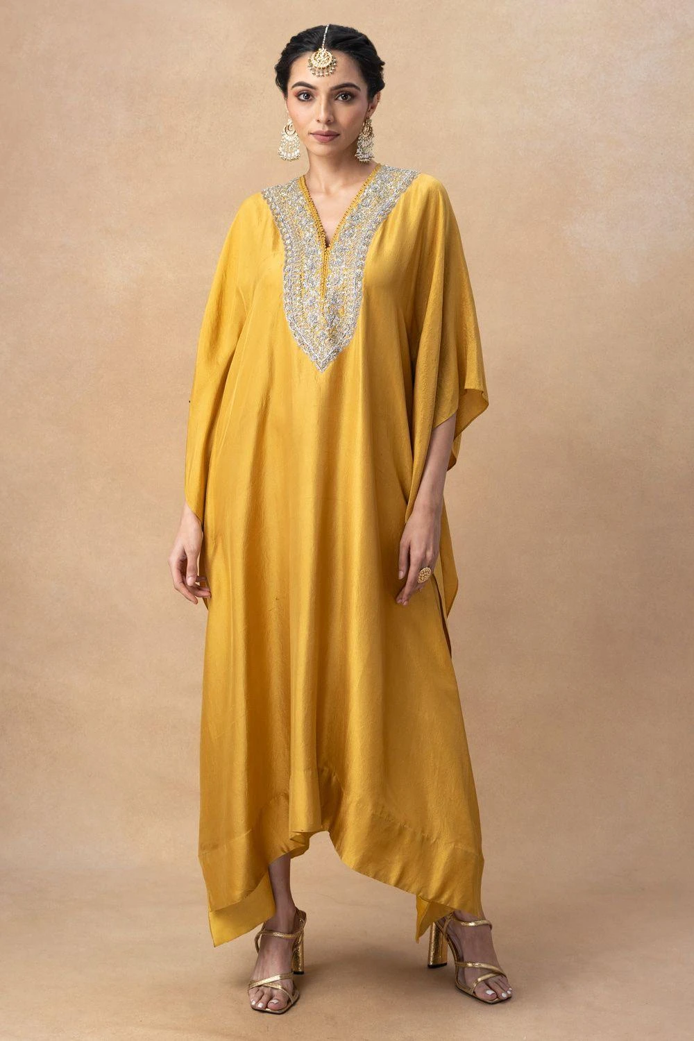 A true masterpiece of artisanal craftsmanship, this kaftan is a celebration of the ancient art of zardosi embroidery, where gleaming gold threads are meticulously woven into sumptuous fabrics.