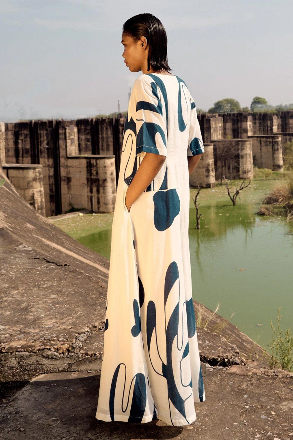 Embrace timeless elegance with this Off-White Lino Print Mul Jumpsuit. Its V-neckline, front zipper opening, and half sleeves exude a classic charm.