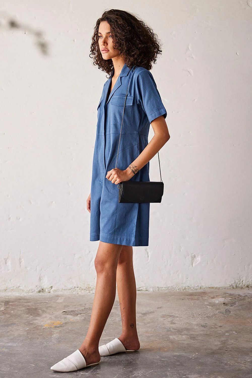 Look effortlessly stylish with this yale blue cotton herringbone jumpsuit. The front zipper opening, lapel collar, and half sleeves define a bold yet refined style that’s perfect for any occasion.