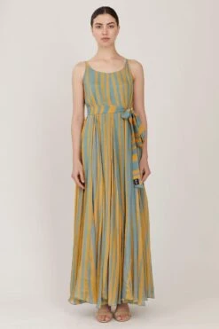 Fresh & breezy, this mustard & blue striped maxi dress is the perfect pick for your next getaway. This versatile dress can be styled in multiple ways. You can dress it up with a pair of danglers and a clutch, or just keep it casual.
