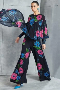 Brunch in style in this mustard & dark pink jumpsuit. It is cut in muslin silk and printed in blooming florals. You can team it up with a pair of chic hoops & wedges to complete your look.