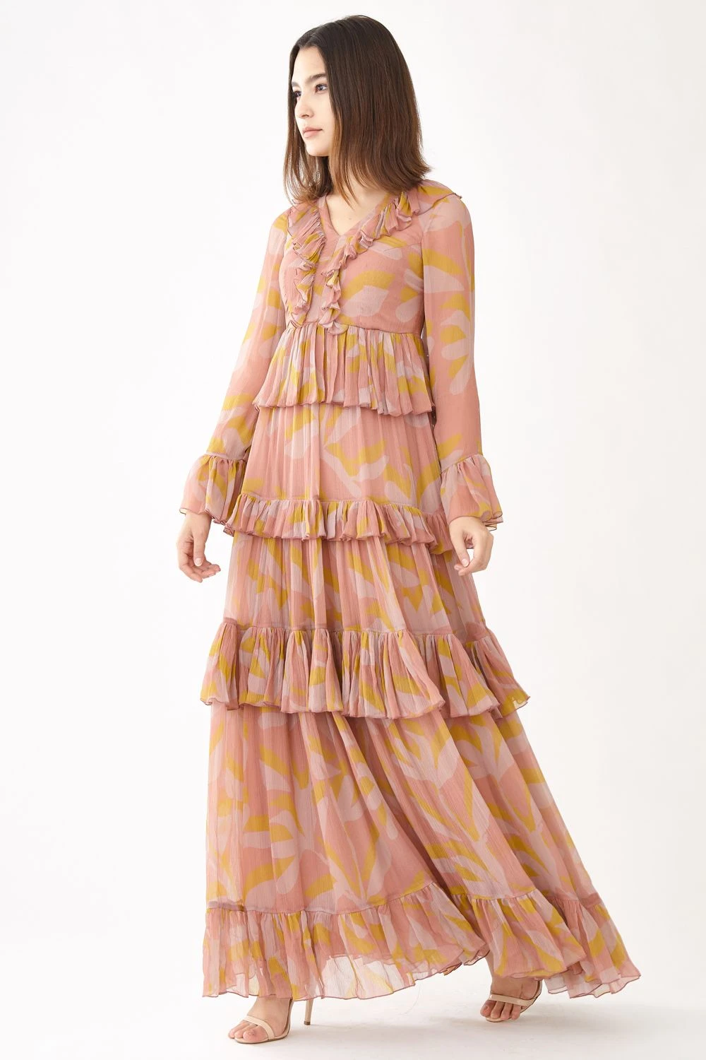 This pink, peach & mustard floral dress is fun & playful, perfect for daytime soirees. It is cut in chiffon and features gentle ruffle detailing. You can style it with a pair of chic hoops & wedges.