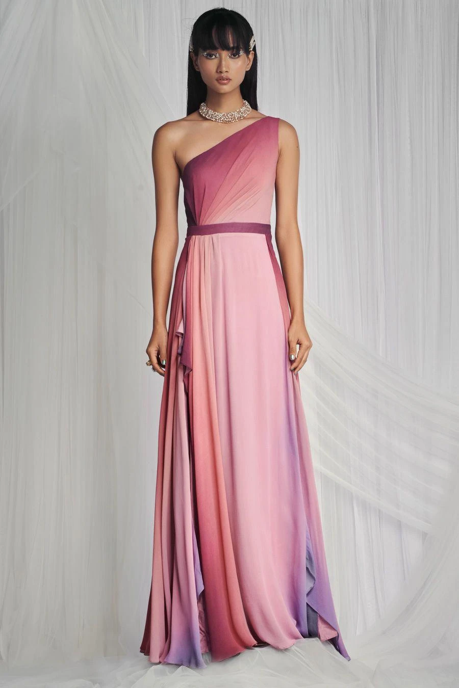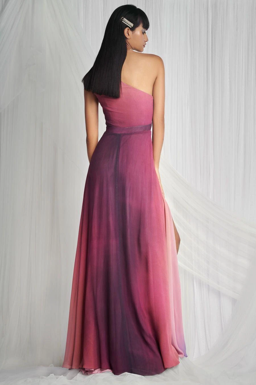 If you’re looking for a head-turning statement-making gown that isn’t too heavy, this is the dress for you. Crafted in georgette, this one shoulder ombre shaded gown features draped details with a thigh high slit.