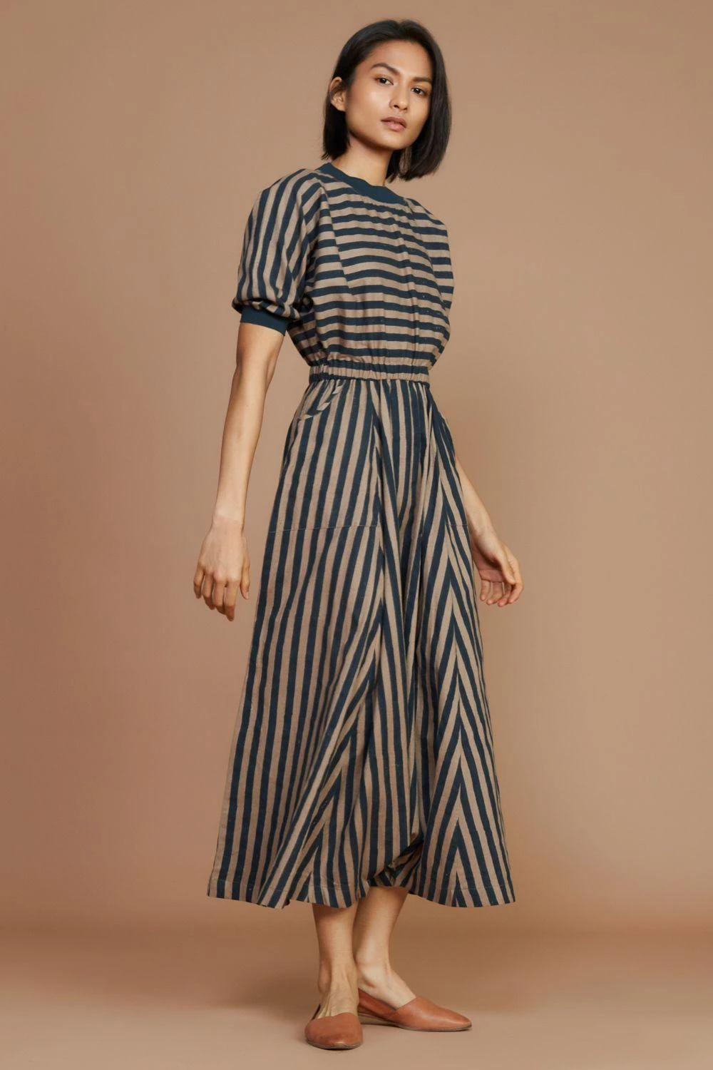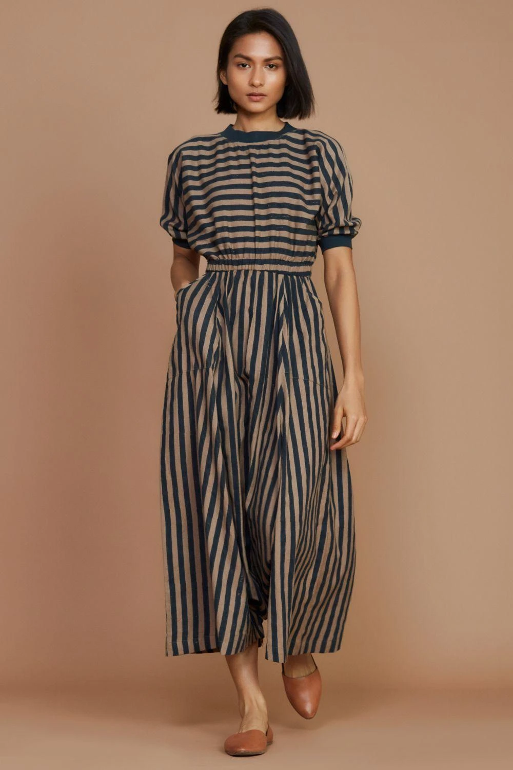 Travel in style & comfort with this brown striped jumpsuit. It is cut in handwoven cotton with a ribbed, neck & sleeve cuff detail. It is cinched at the waist and fastened with back buttons. Style it with a pair of sneakers & you’re good to go.