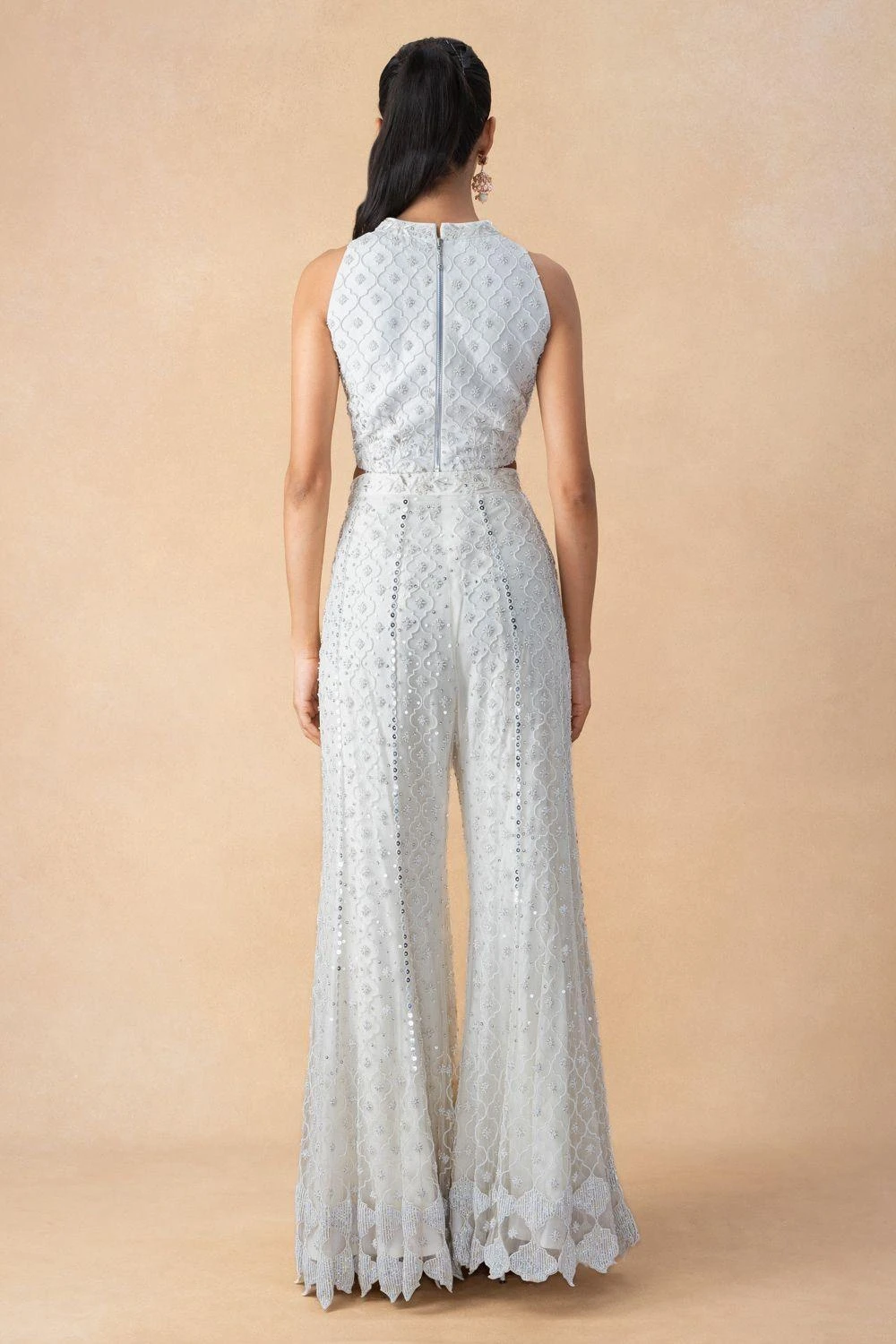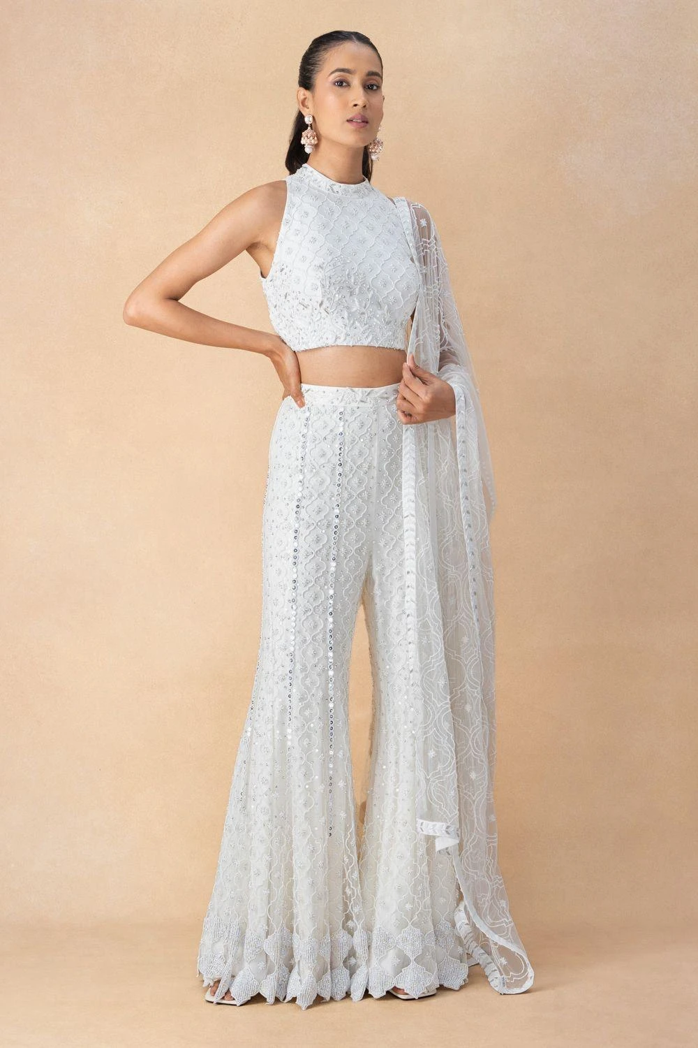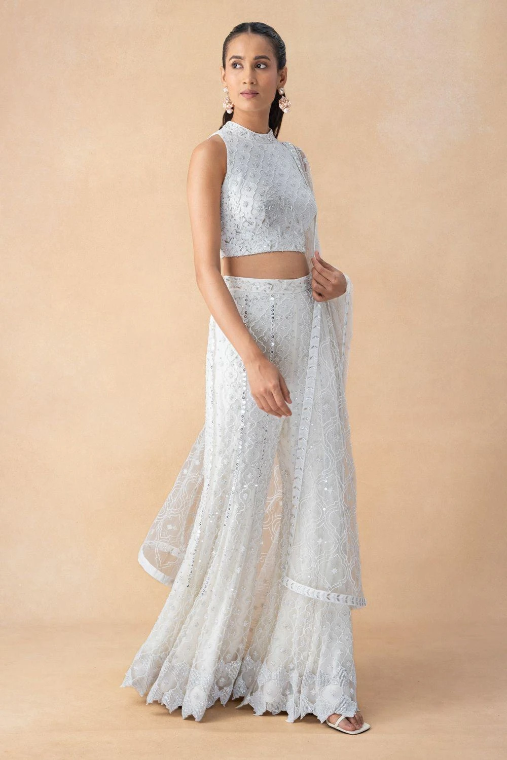Step into opulent elegance with this embroidered sharara set. This ensemble is a testament to the perfect fusion of intricate craftsmanship and modern sophistication, setting the stage for a remarkable look.