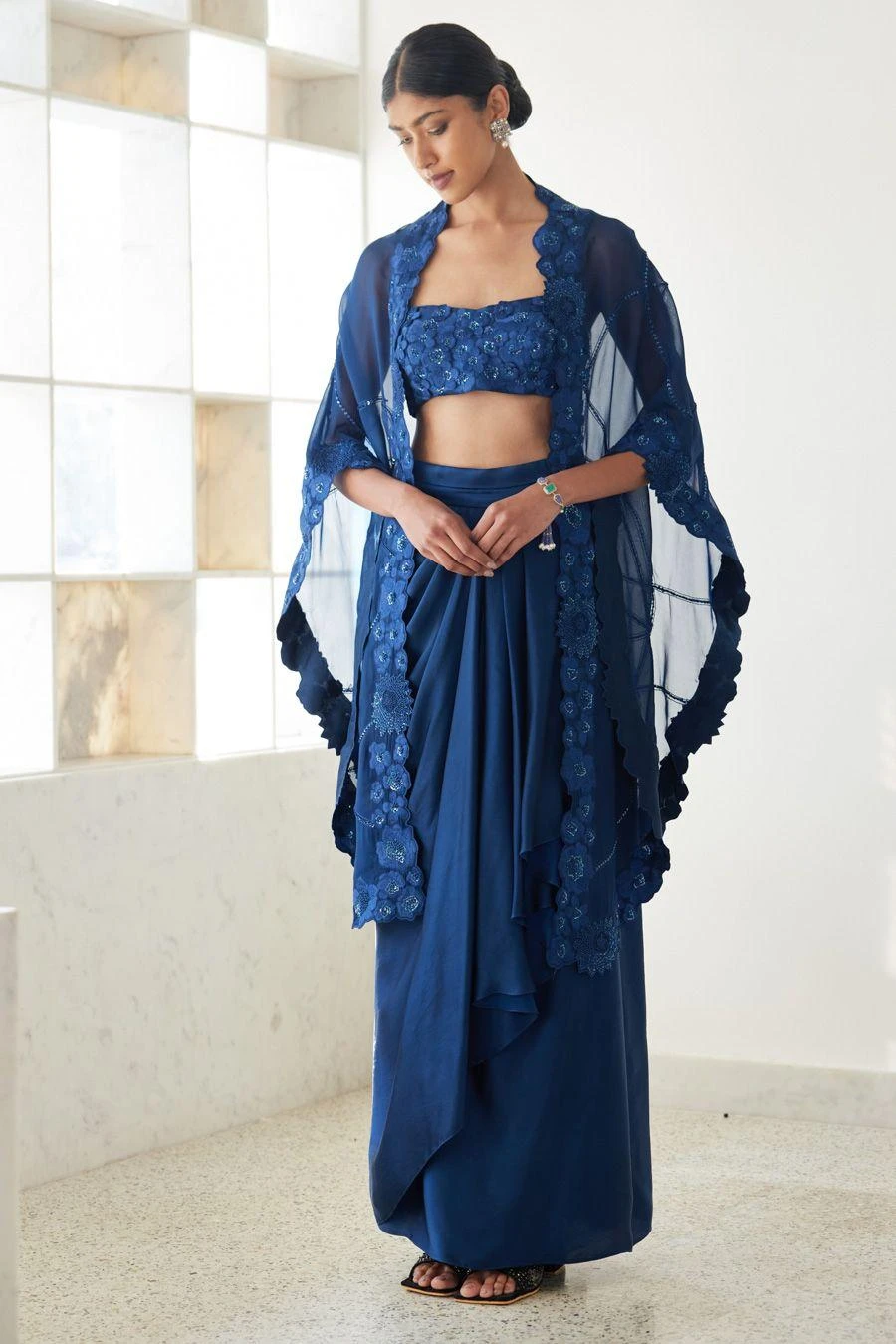 Swap your dupattas for capes this wedding season. Crafted in organza, this set features an embellished cape paired with a crop top and a draped skirt. Add a pair of statement earrings to complete the look.